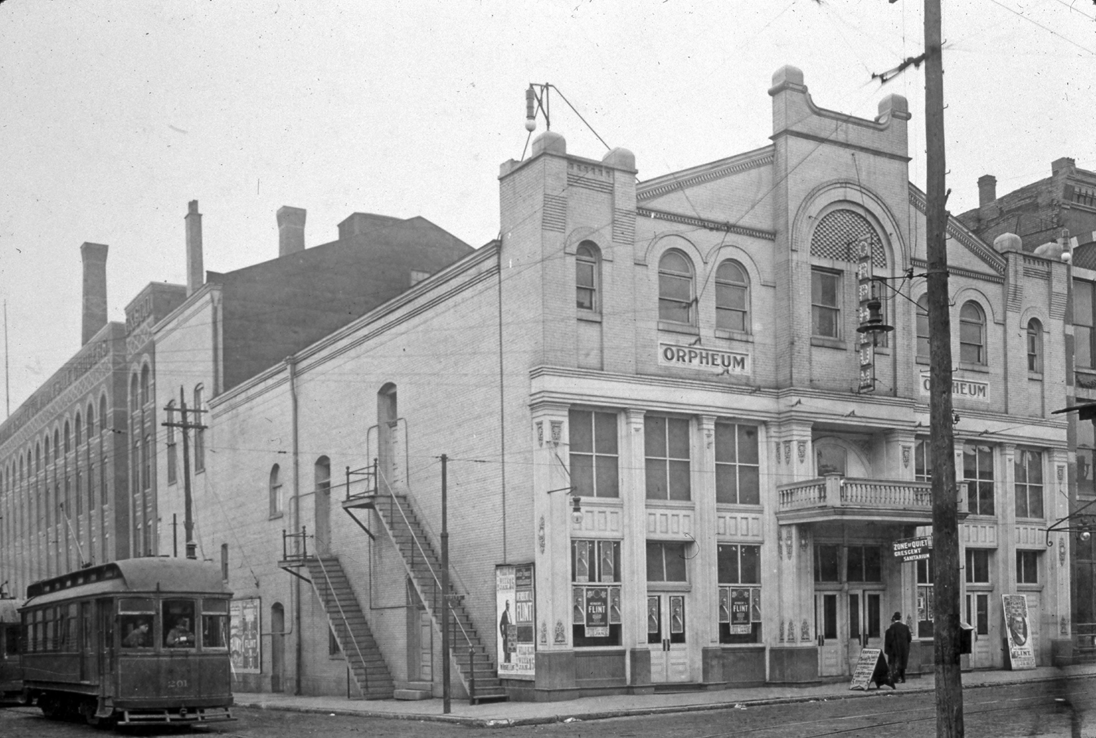 Orpheum Theater at 323-325 Upper 1st St. opened in 1892 as the (new) People's Theatre, and was renamed the Orpheum in 1908 when it came under new ownership. It burned to the ground in 1917. NOTE: There is a sign on the post that calls for a "Zone of Quiet Crescent Sanitarium" which was located within a block of this. The streetcar is on Locust St. The entertainment listed on the signs is not legible enough to be identified and/or researched.