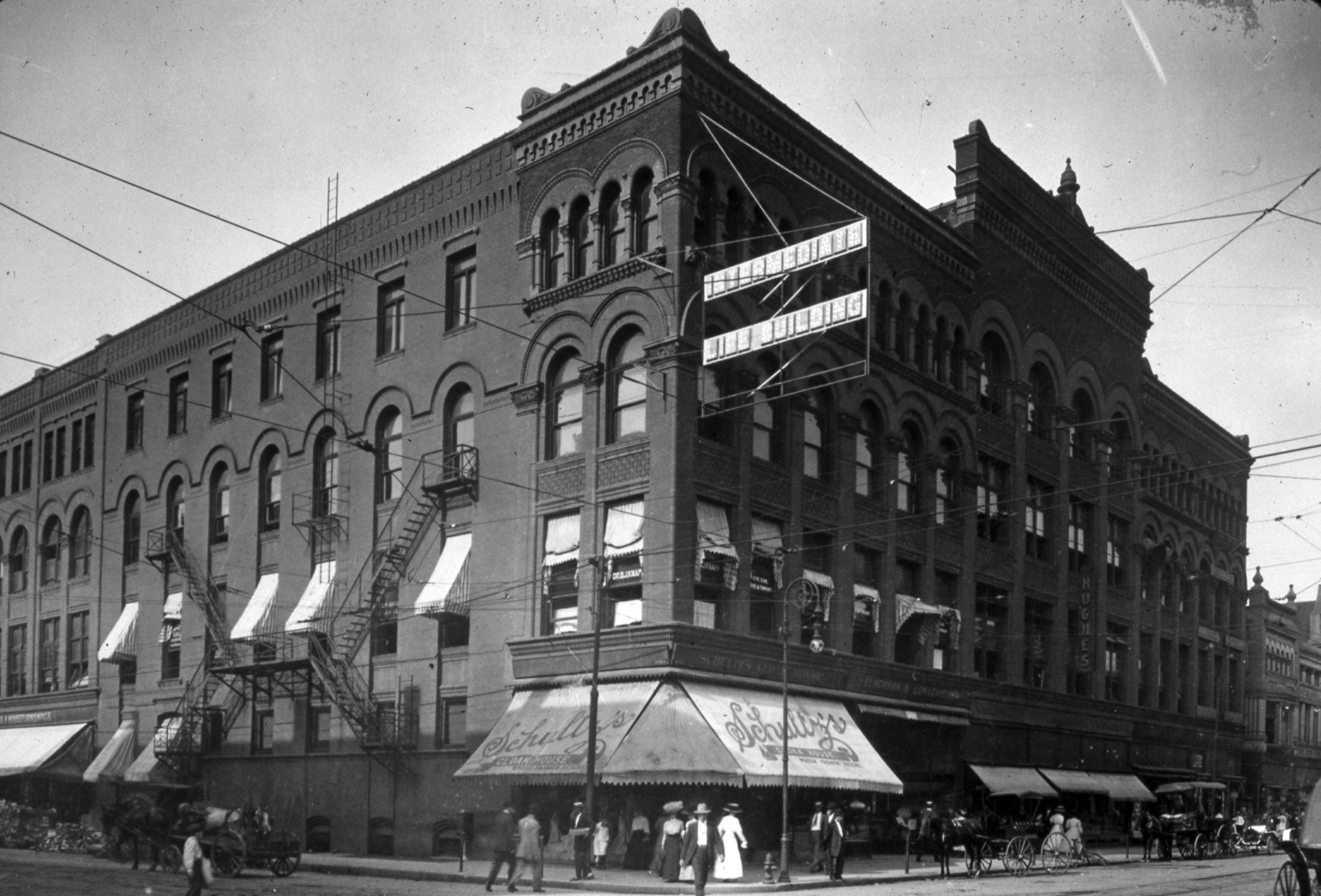 Intermediate Life/Hughes Building/Eichel Block at 300 Main St. which was built in 1892, with part of the foundation from the 1852 courthouse that stood nearby. A number of different businesses occupied a portion of this space over the years. The structure was damaged by the fire in the Economy Store in 1951 (which destroyed a large portion of this block) and that portion torn down. The building was razed in 1984. Here one of the tenants is Schultz's Cloak House.