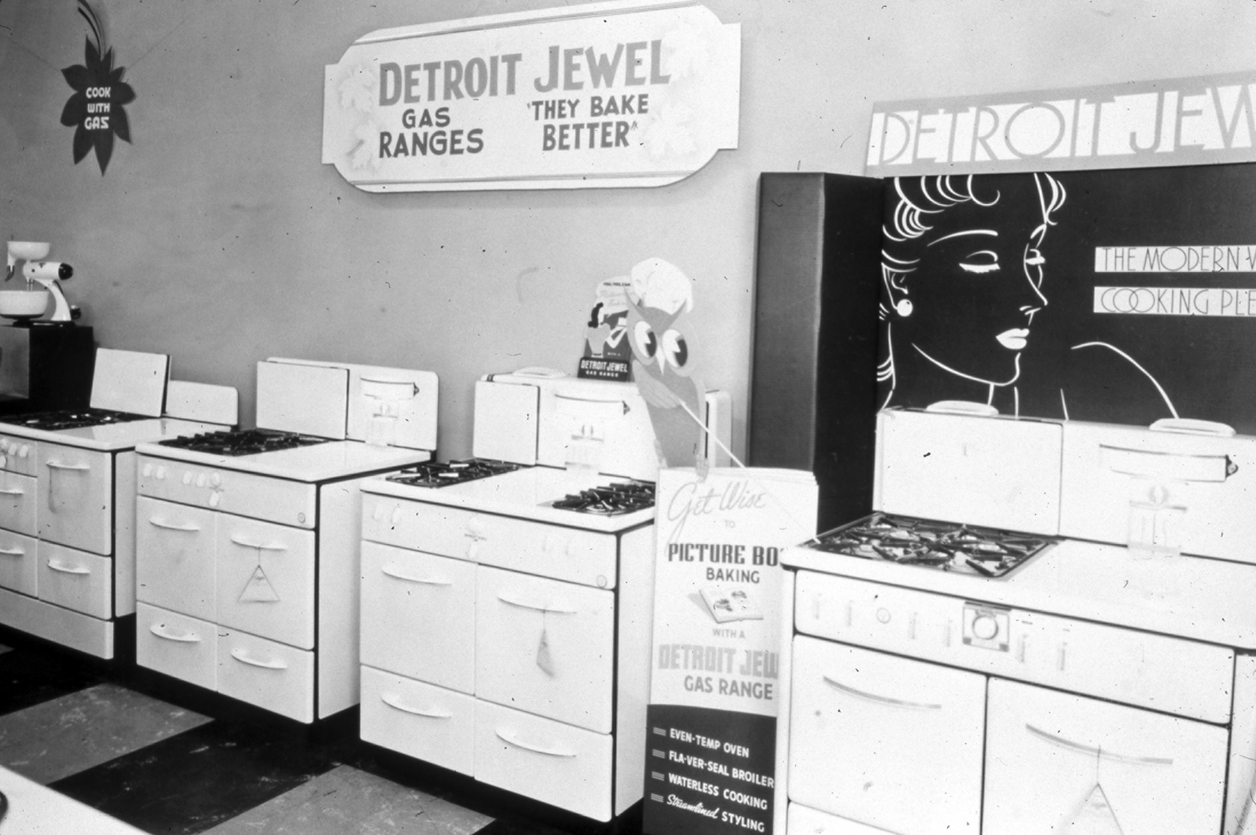 In this photograph, gas ranges, the Detroit Jewel model or brand, are on display. A mixing bowl is visible far left. The location is this display is unclear