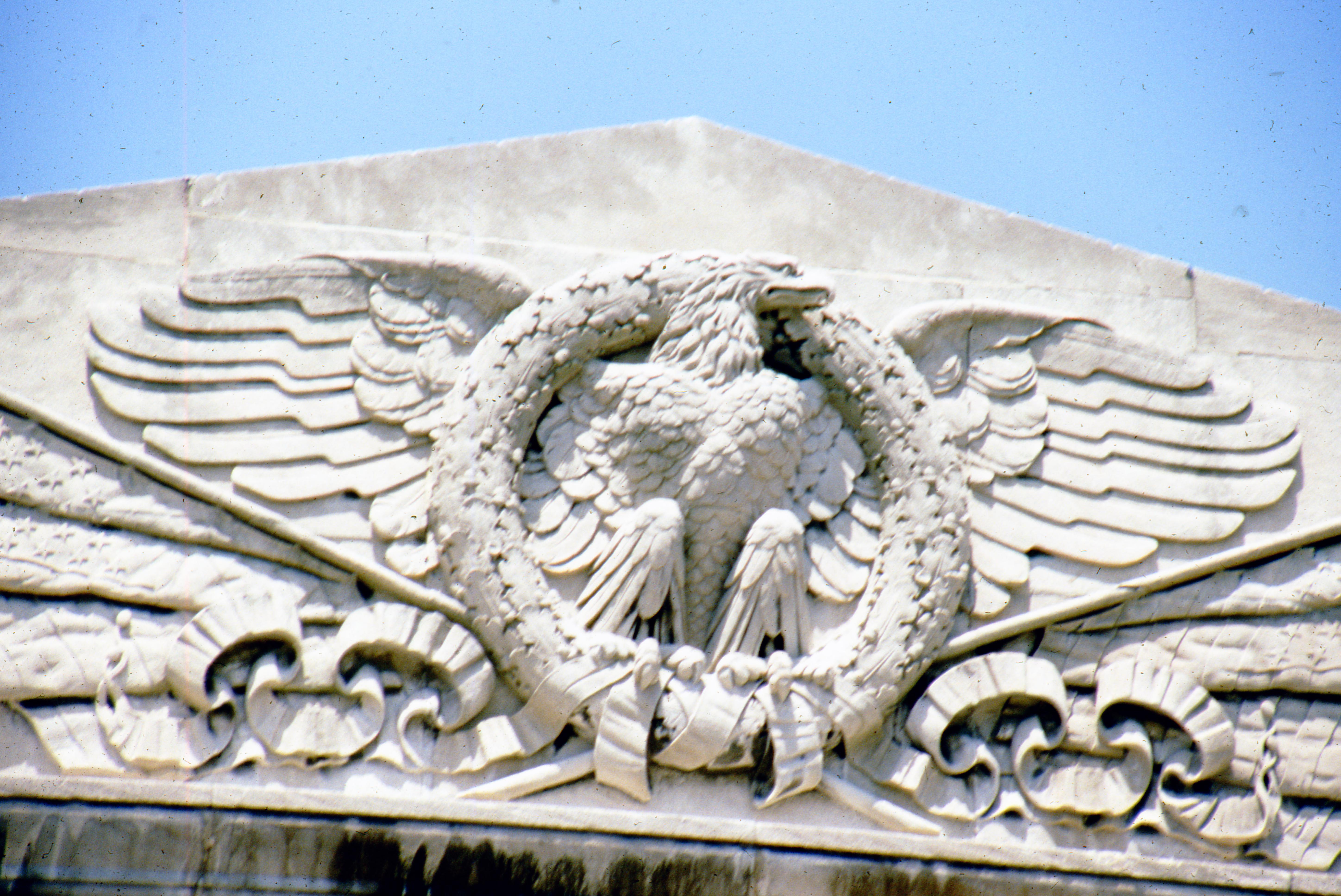 The Soldiers and Sailors Memorial Coliseum at 350 Court St. It was built in 1916-1917 as a tribute to the men of Vanderburgh County who fought in the American Civil War and Spanish�American War. What is shown here is on the pediment of the building, and is a bas relief of the the'flag and eagle emblem of the Grand Army of the Republic. For more details, see https://npgallery.nps.gov/GetAsset?assetID=859fb122-6be8-473b-9fb1-1812205c8484