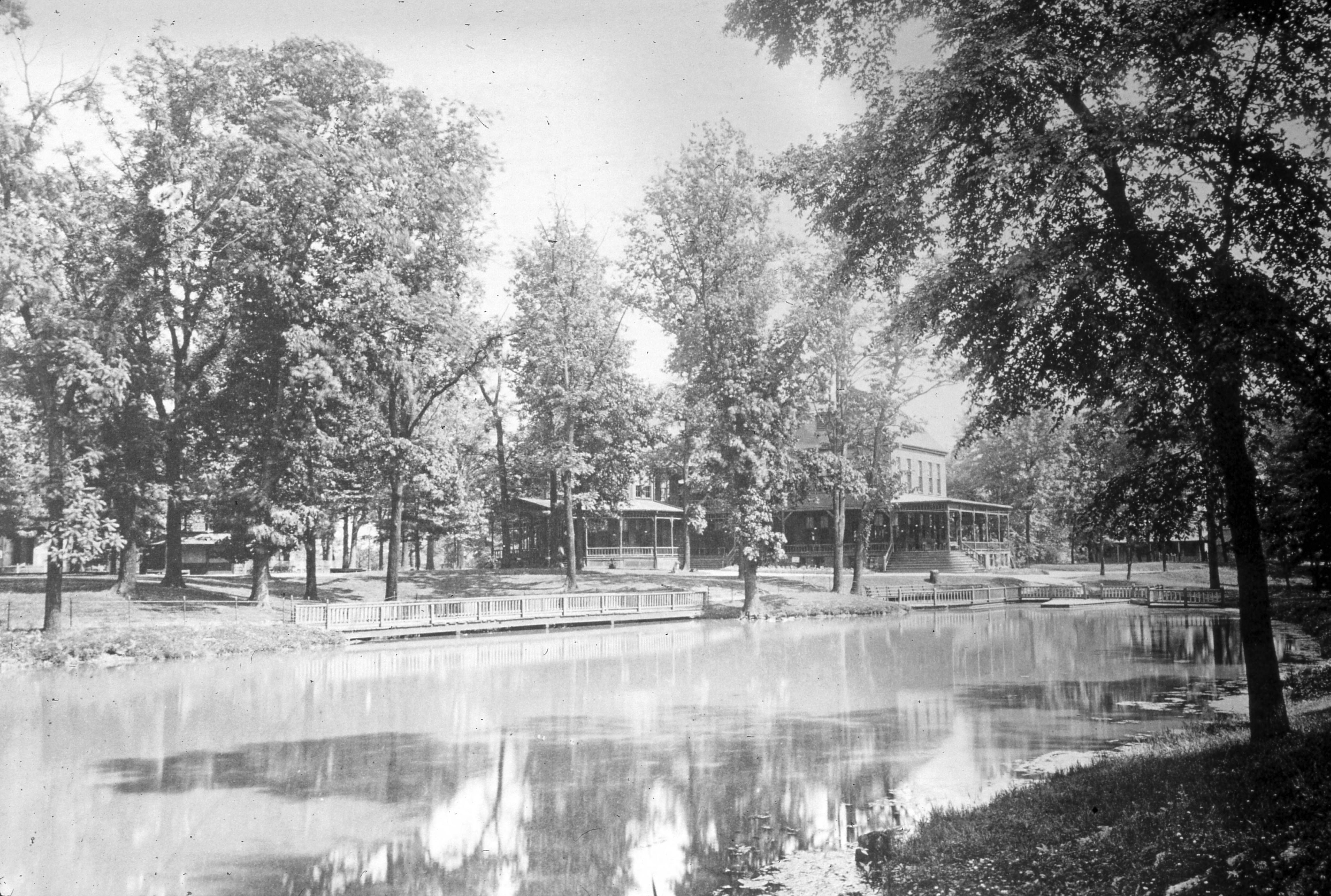 Cook's Park buildings and lake, at what was formerly 410 W. Maryland St. "Pigeon Springs was a very popular health resort in the 1850's. It was located on the east bank of Pigeon Creek, where Maryland Street now crosses. It had extensive buildings for lodging guests who came to enjoy the rest and the mineral waters. William Bates, the proprietor, catered especially to the Southern trade. (http://historicevansville.com/image.php?id=recreational%2FPigeon+Springs+-+sketch.jpg) A salt well was part of the park. Through the 1860s-1890s the ownership/name seems to have varied, but sometime between 1890-1895, the F.W. Cook Brewing Co. constructed/reconstructed Cook's Park on this location. The club house (sometimes called the pavilion) and lake date to 1915. Later known as Exposition Park and Pleasure Park, it operated until the Prohibition years, and the clubhouse was razed in 1935. Nothing remains of this park today.