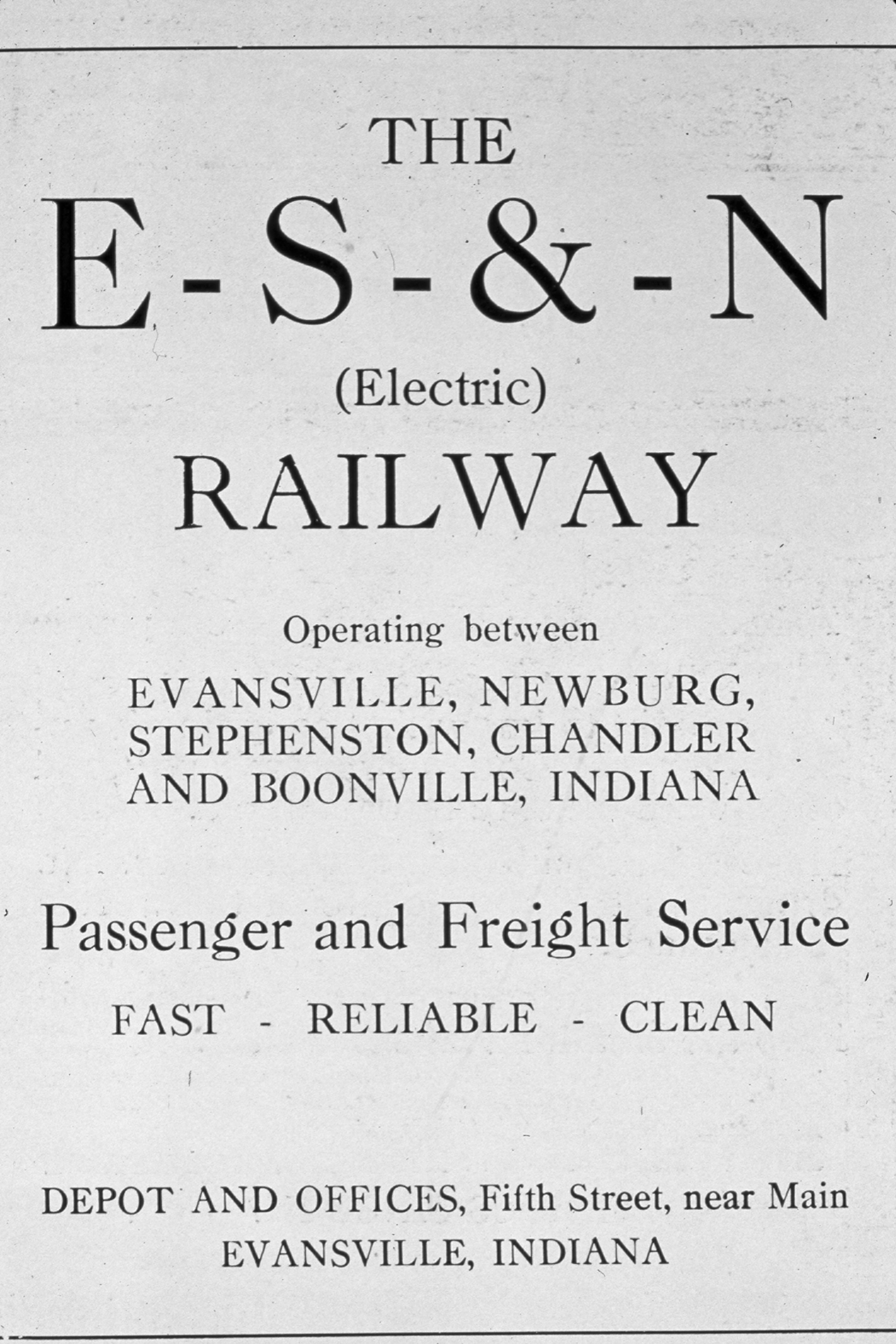 Advertisement, worded thus-- "E-S &-N (Electric) Railway Operating between Evansville, Newburg, Stephenston, Chandler and Boonville, Indiana Passenger and Freight Service Fast�Reliable�Clean Depot and Offices, Fifth Street near Main Evansville, Indiana" According to the Historic Evansville website, "The Evansville Suburban & Newburgh Railway provided passenger service to East Side suburbs and Newburgh Station. [It was] built c1907 by Harris & Shopbell, next to [the] Majestic Theater [and] replaced [the]old depot. [The] tracks extended to 4th and Cana,l along Canal to Willow, followed the railroad to Chandler [and] Boonville. [The] line [ran] east of the city and crossed Lincoln near Green River Road. Passenger service stopped 1930 and only hauled freight. Completely closed 1940s. Station razed by 1962. (http://historicevansville.com/site.php?id=esnstation)