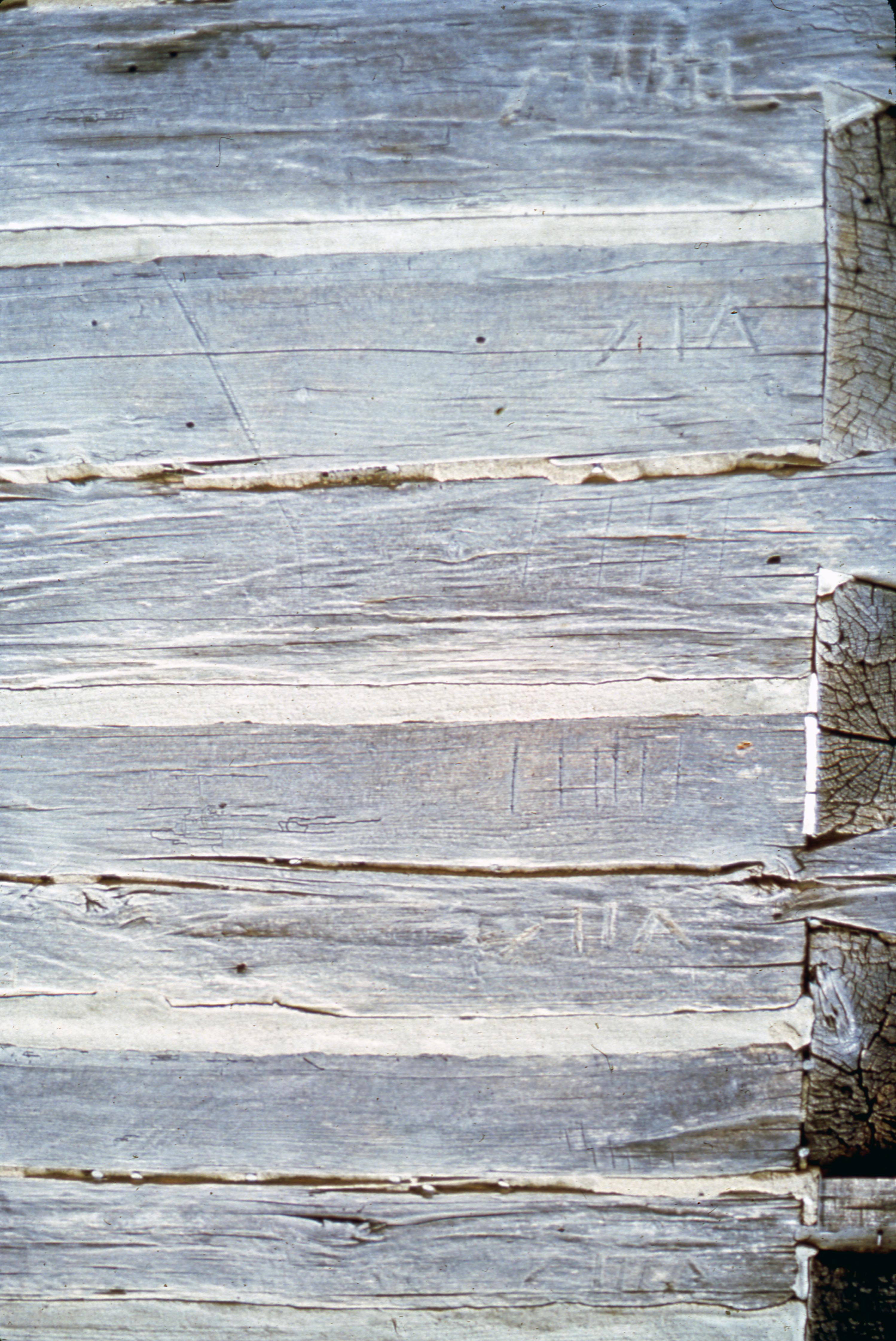Detail of the corner of a log cabin, with the logs evenly squared off. Note the markings on the logs. The Harmonists generally cut all the lumber, then brought it to the site to assemble. These markings indicate how the logs are to fit together. As to the Harmonists themselves, "New Harmony was founded in 1814 by a group of 800 Pietists from W�rttemburg, Germany. The Harmonie Society, led by George Rapp, arrived in the United States in 1804, seeking religious freedom and establishing a community in Butler County, Pennsylvania. After ten years in Pennsylvania, the Harmonists purchased nearly 30,000 acres on the banks of the Indiana Territory�s Wabash River. The Harmonists� literal interpretation of biblical text, combined with their interpretation of current world events, led them to believe that a Second Coming of Jesus Christ was imminent. As a society and as individuals, they pursued Christian perfection through every aspect of their daily conduct. To that end, they created a highly ordered and productive community at New Harmony. Within a year of the land purchase, the town founded by the Harmonie Society was platted by a professional surveyor. Between 1814 and 1824, the Harmonists constructed over 180 log, frame and brick structures in their settlement. The community was entirely self-sufficient, and produced a wide variety of goods that were recognized worldwide for their fine quality. Harmonist wares were sold throughout the United States and overseas in the British Isles, the Netherlands, Switzerland and Germany. Through divine guidance, George Rapp sought a buyer for the entire town in order to facilitate their relocation back to Pennsylvania in 1824. He found a purchaser in Robert Owen, a wealthy industrialist of Welsh descent, who was operating a textile mill in New Lanark, Scotland."