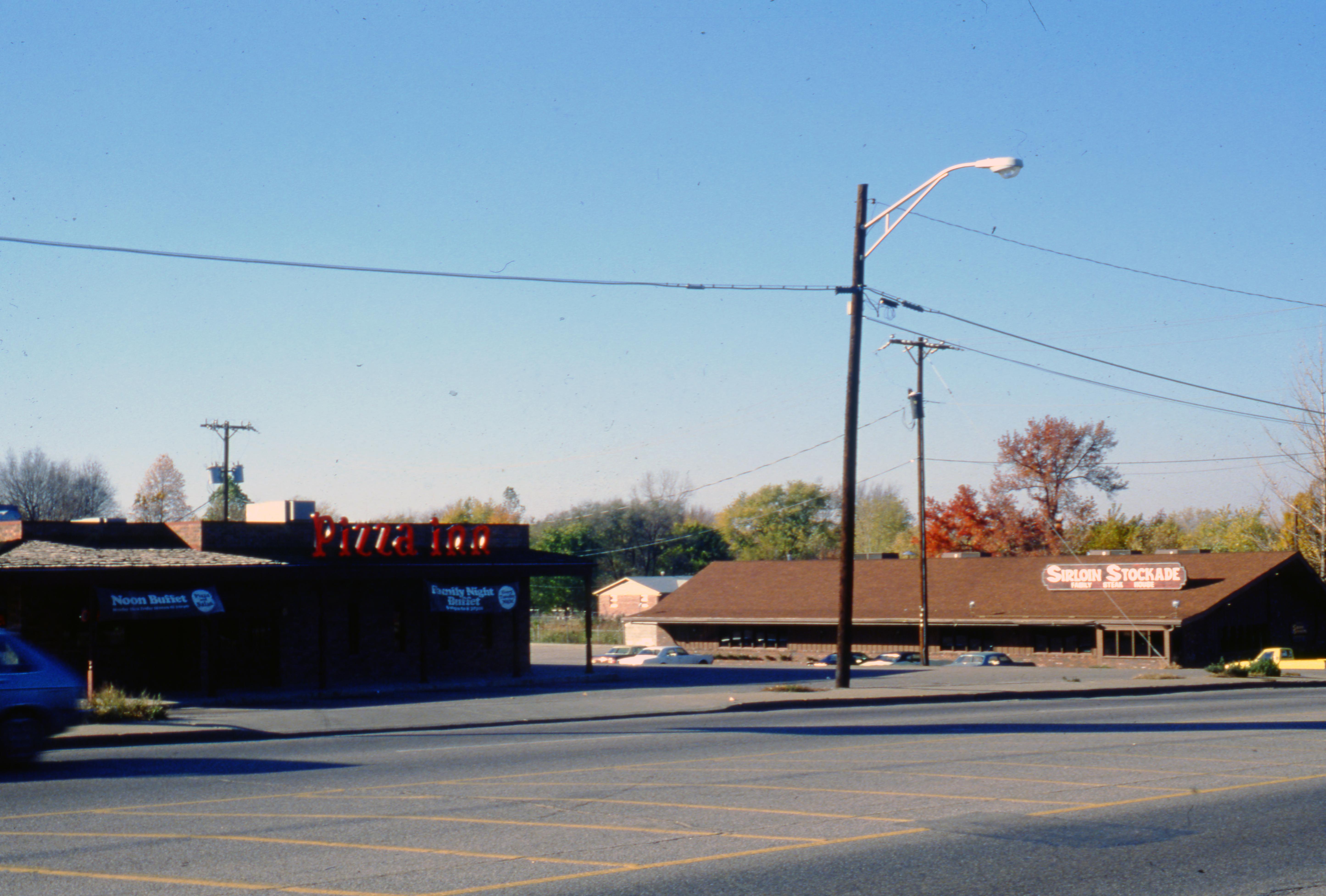 S. Green River Rd., from the T-intersection with Shamrock Dr., with these businesses: Pizza Inn at 501 S. Green River Rd. and Sirloin Stockade at 405 S. Green River Rd. Neither these businesses nor these buildings still exist. SEE MSS 184-0235 for a view across the street.