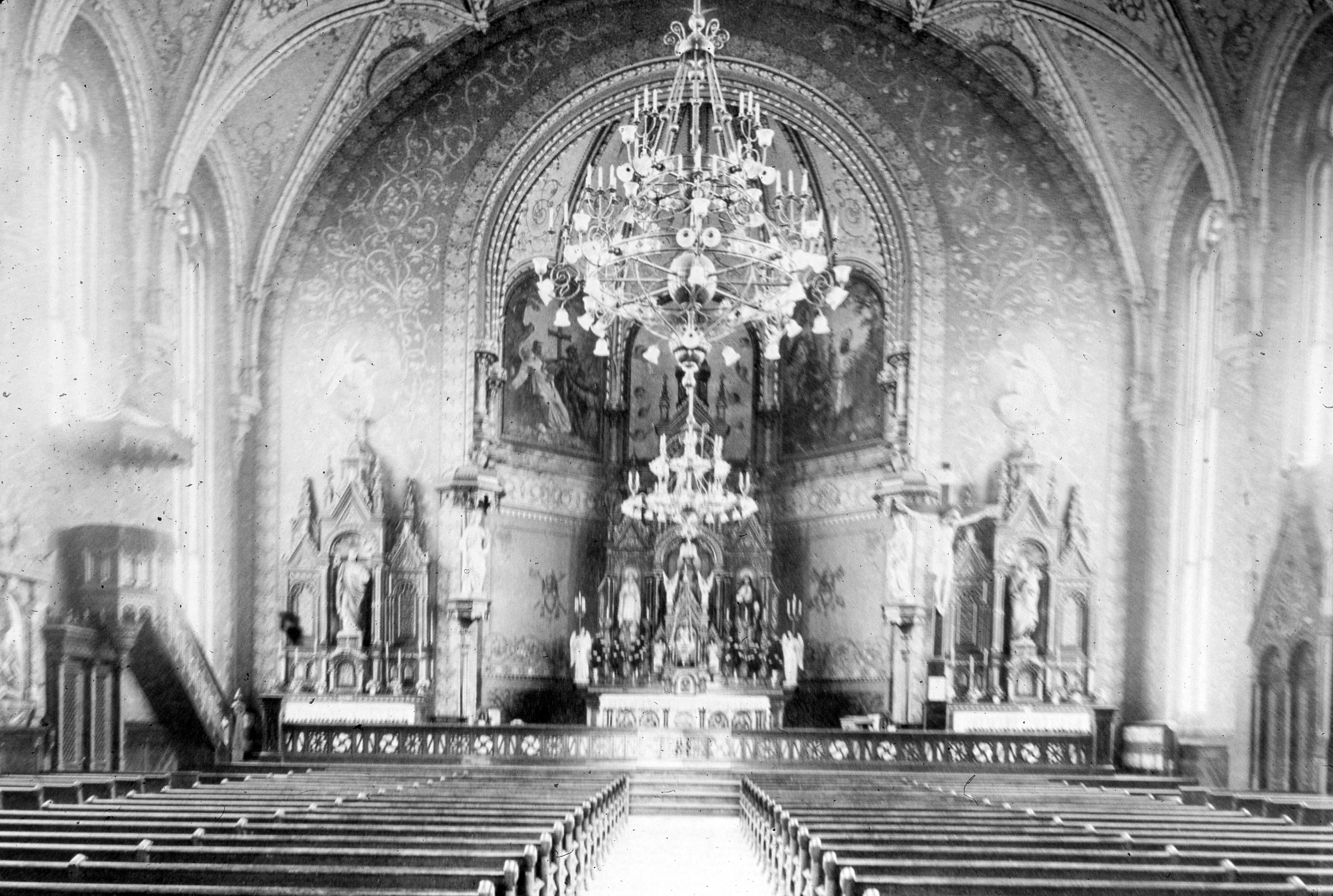 Sanctuary of St. Mary's Catholic Church at 613 Cherry St. "With a continuous flow of German immigrants settling in the Evansville area, Bishop St. Palais acknowledged a need for a new church to service the needs of the community. At the time there were only two Catholic churches in the area - Assumption and Holy Trinity (the German speaking church), which was already very overcrowded. Therefore, St. Mary's was built to provide the German immigrants with a place to worship. The church was designed by architect Ludwick Reidinger of Lawrenceburg, Indiana, in 1866. The cornerstone was laid on October 28, 1866, and the church held its first mass December 21, 1867. The church was officially dedicated January 1, 1868 and mass was conducted in both English and German. A two-story school was erected on the corner of Cherry and 6th in 1866 before the church was built. It probably served as a temporary chapel until construction was completed. In 1871, the Franciscan sisters of Oldenburg, IN erected a second brick school building on the property. This three-story facility provided school rooms for female students and housed the sisters� residence. The old school building became the boys school. (School closed in 1970.) A two-story pastoral residence was erected 1881. In 1910 the entire brick facade of the church was covered with concrete-simulated stone or "sham-rock". In 1936 fire damaged much of the church and it was painted and re-frescoed. At this time the sanctuary was made larger and the choir loft was made smaller. The stained glass windows in St. Mary's are another highlight of the interior which add to the aesthetic beauty of the church. Stained glass windows were installed in 1941 by Emil Frei studios in St. Louis. There are sixteen windows in all that tell the story of the life and death of Christ through the mystery of the rosary. In 1989 the church was once again restored. (http://historicevansville.com/site.php?id=stmary) This is the oldest Catholic church building in the city. Interestingly, on 1895 and 1910 Sanborn maps, the German heritage of the church is reflected in how it is listed: St. Marien Kirche and Schule. What is seen in this photo looks much the same today.
