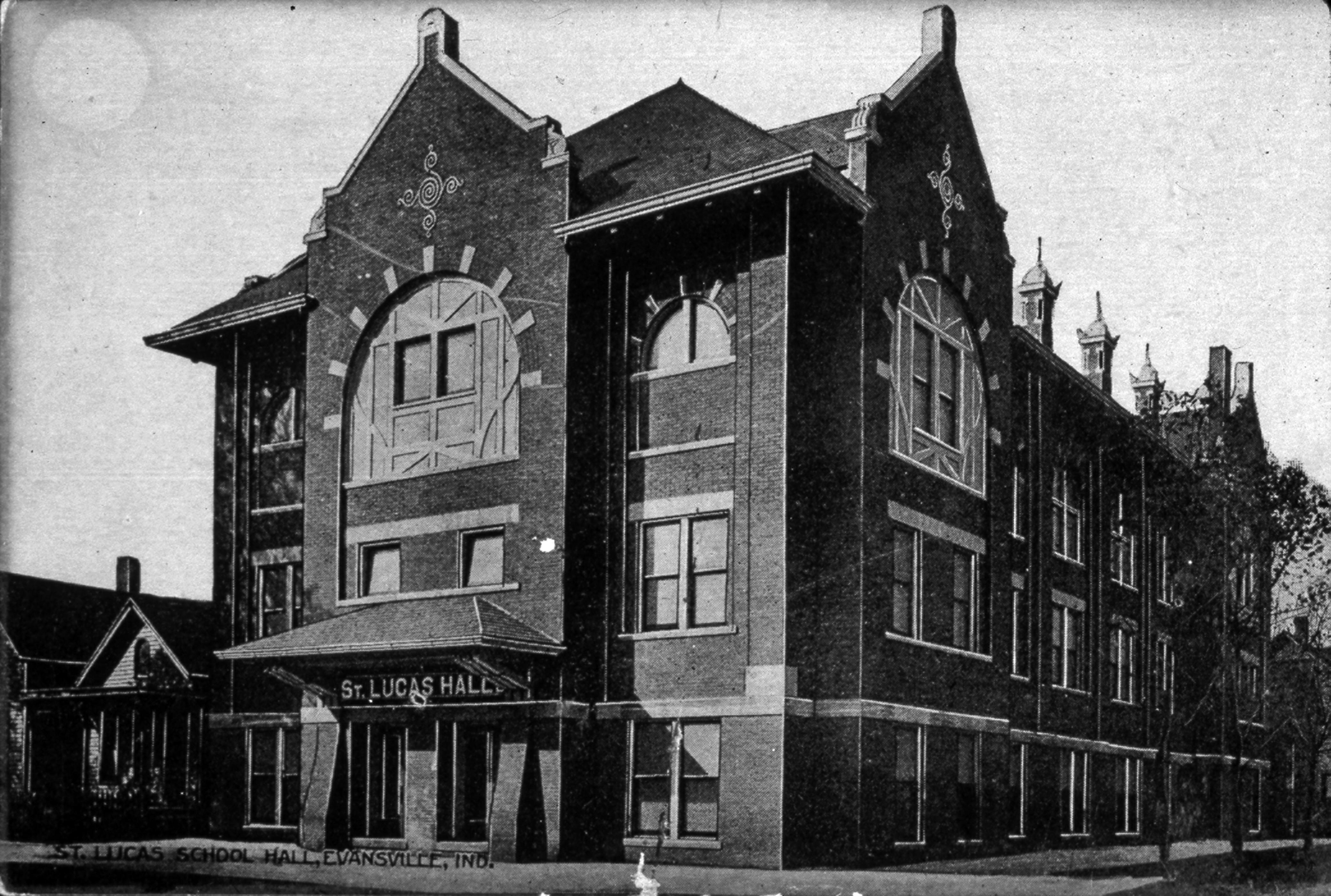 Postcard of St. Lucas Sunday School Hall, at 33 W. Virginia St., originally 1100 E. Virginia St. St. Lucas Evangelical Church/St. Lucas German Evangelical/ St. Lucas Evangelical and Reformed, now St. Lucas United Church of Christ: "On July 14, 1889, Pastor Schmidt arrived in Evansville to lead a new German-Evangelical congregation. On July 21 St. Lucas was born. Dedication of the sanctuary took place on April 20, 1890. St. Lucas continued to grow and the Sunday School Hall was dedicated on October 27, 1907. The 21 stained glass windows were bestowed on September 21, 1911. St. Lucas has continued to thrive and had many updates to further God�s calling. The St. Lucas Parish Hall went through many changes during its existence as our Sunday School home. Many fun and exciting events took place in this building. The church bazaar was always looked forward to with anticipation as to what would be found in the craft booths. Of course, the chicken and dumplin� dinner was always delicious and enjoyed by many in the community. During the 1937 flood the Indiana Naval Militia quartered in the parish house. The church office also became a broadcasting station of military forces. Then on March 2000 the Parish Hall became Lucas Place. This is now a key mission of St. Lucas Church. (http://stlucasevansville.com/history/) NOTE: This building is not physically part of the church proper, but is diagonally across the street.