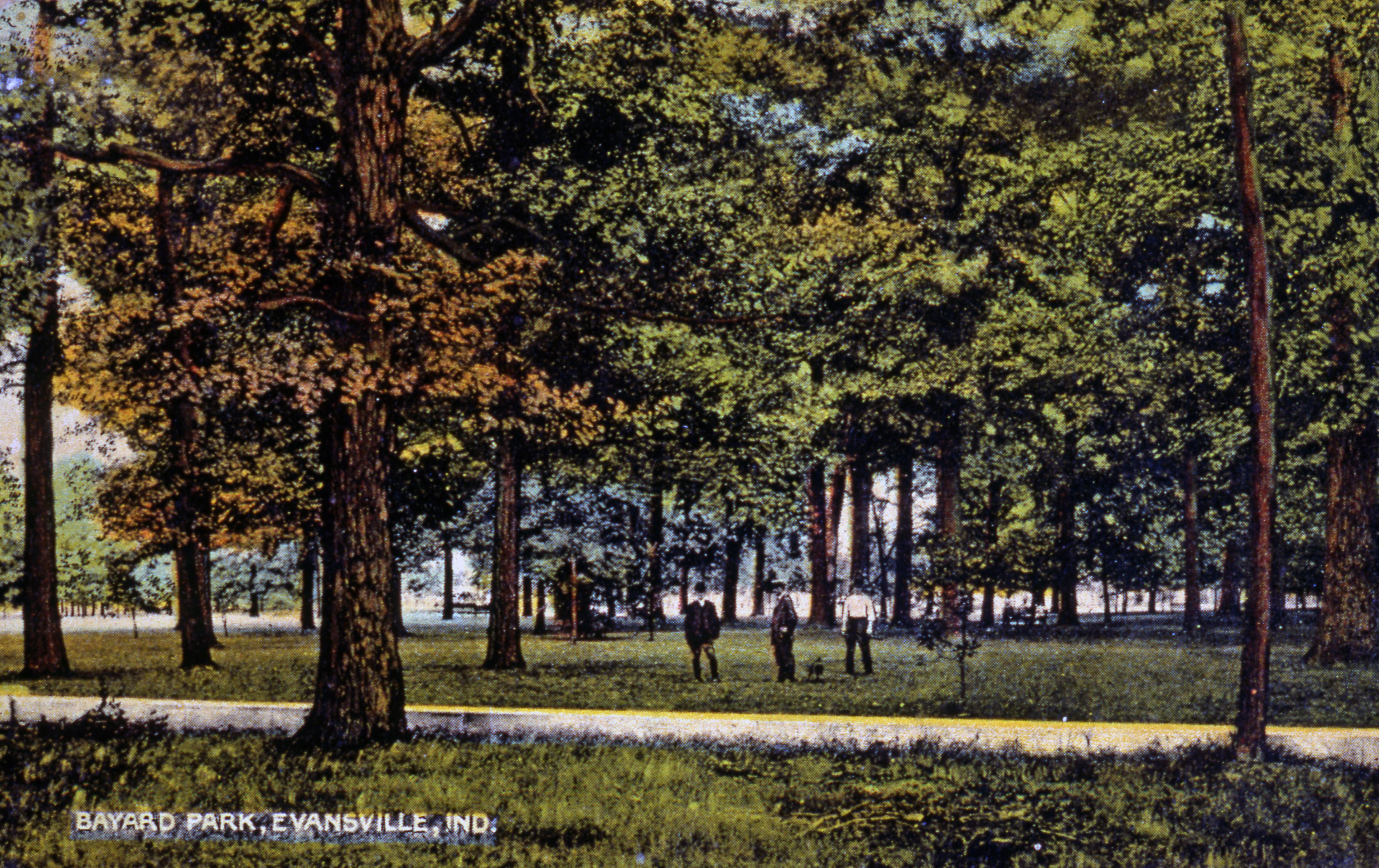 Postcard of Bayard Park, Evansville, Ind. Samuel Bayard was a prominent banker in Evansvillle. After his death, his widow donated 10 acres to form this park, named in his honor. It is bounded by Bayard Park Dr. and E. Powell Ave. (north and south) and S. Bedford Ave. and S. Kentucky Ave. (west and east). Professionals built their homes around it, largely 1901-1915. One of Evansville's 2 Carnegie libraries is adjacent to the park.