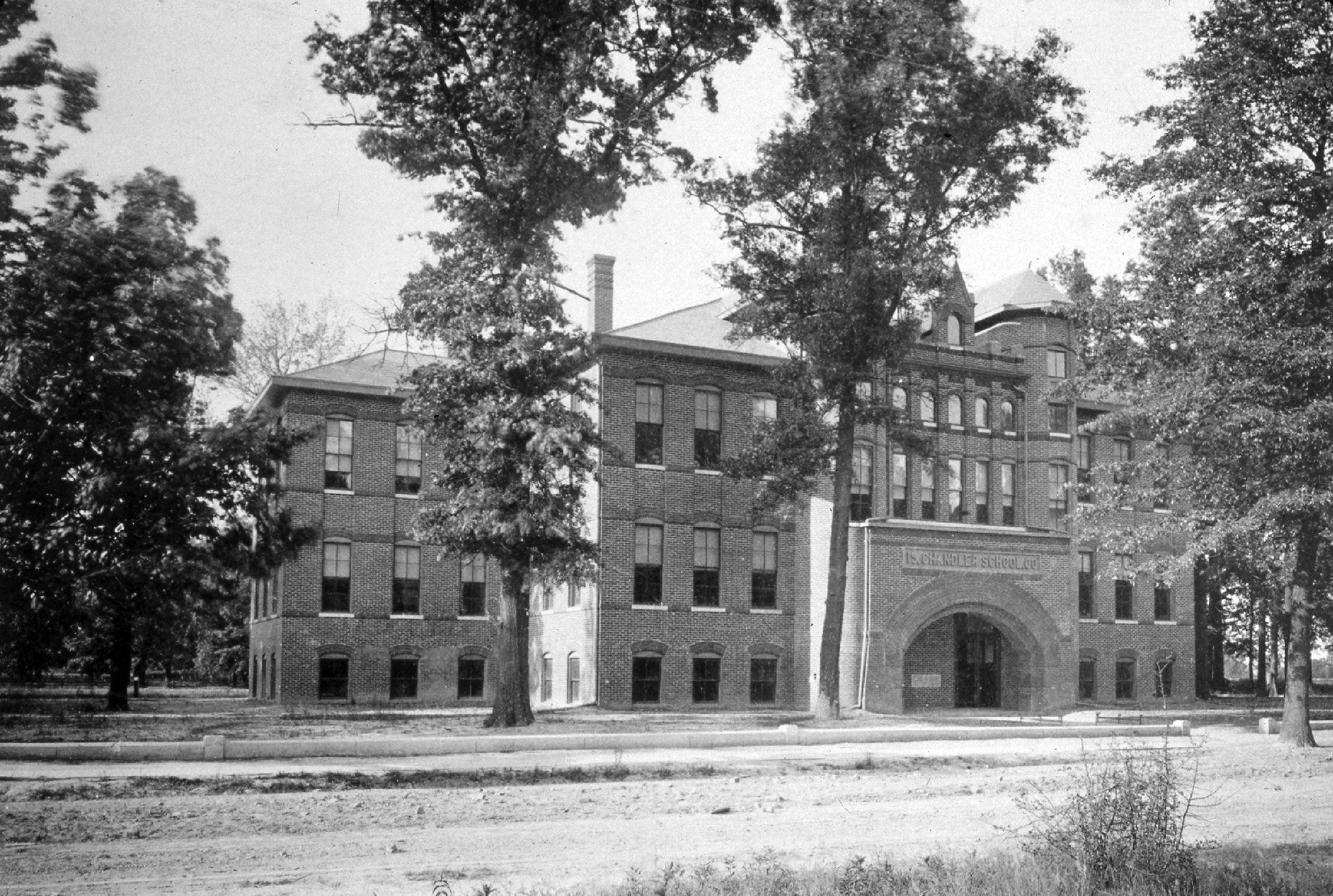 "Completed in 1901, Chandler Avenue School was built to relieve crowded conditions at Campbell School. It was located at the north end of Bayard Woods at the northeast intersection of Chandler Ave. and Evans Ave. In 1915 an addition was added to the school and the new entrance faced Evans Ave. The school was renamed Stanley Hall School, after G. Stanley Hall (1844-1924), an American psychologist and educator. [An] annex on Bayard Park Dr. [was added circa] 1920[;] additional facilities and rooms [were added] at Stanley Hall [in the] 50s. In 1972 the school was closed and razed except for the gym (annex? The remaining portion of the building housed Stanley Hall Enrichment Center, an alternative education program for high school students. Stanley Hall was vacated when the alternative education program moved out to the new Southern Indiana Career and Technical Center out on Lynch Rd." Since only the gym was left after the 1972 razing, nothing standing today even remotely resembles this.