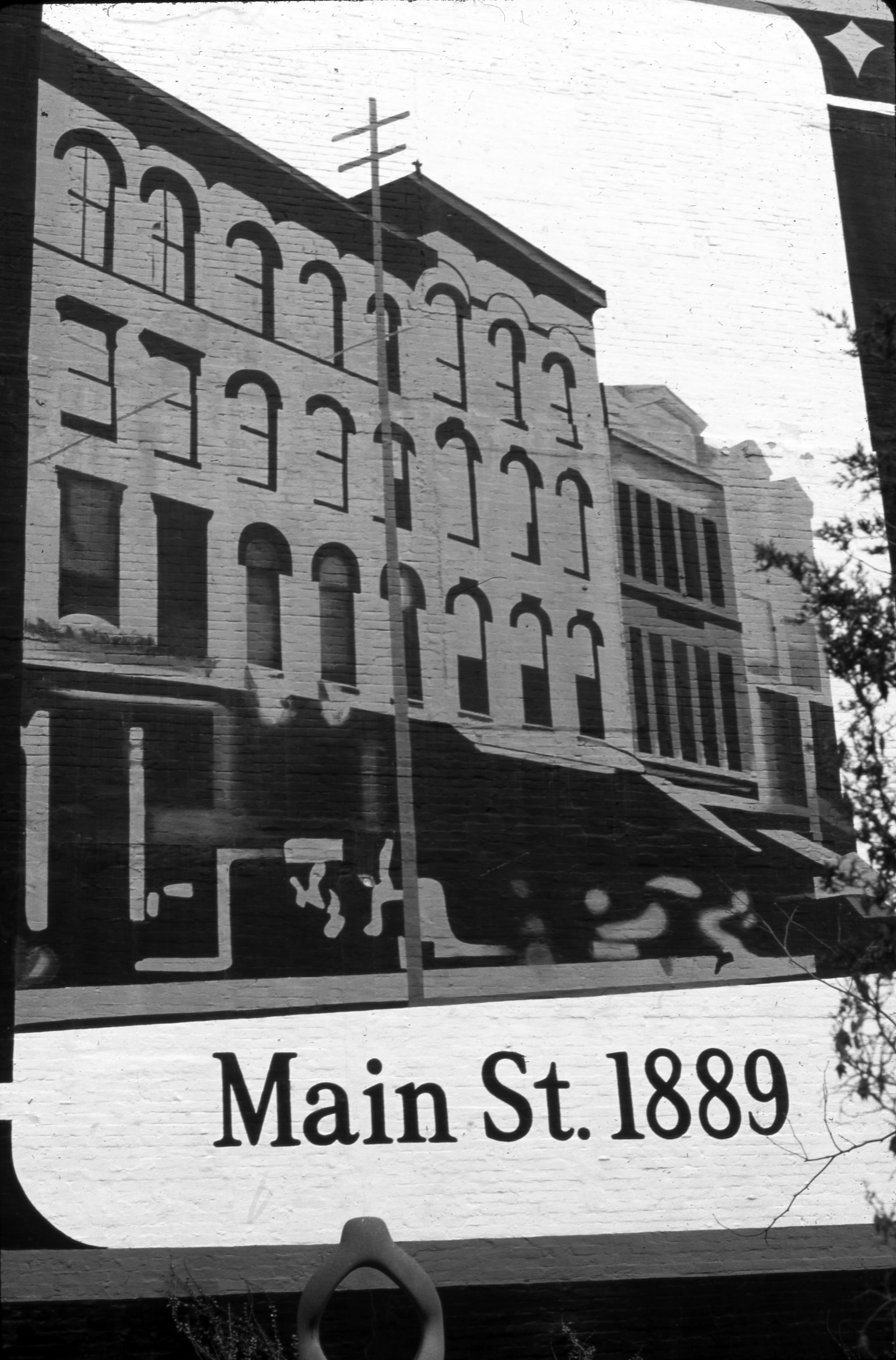 This is a panel from a mural on the 4th St. side of The Baby Shop, Inc. at 404 Main St.. It shows Main St. in 1889. This mural and its building no longer exist.