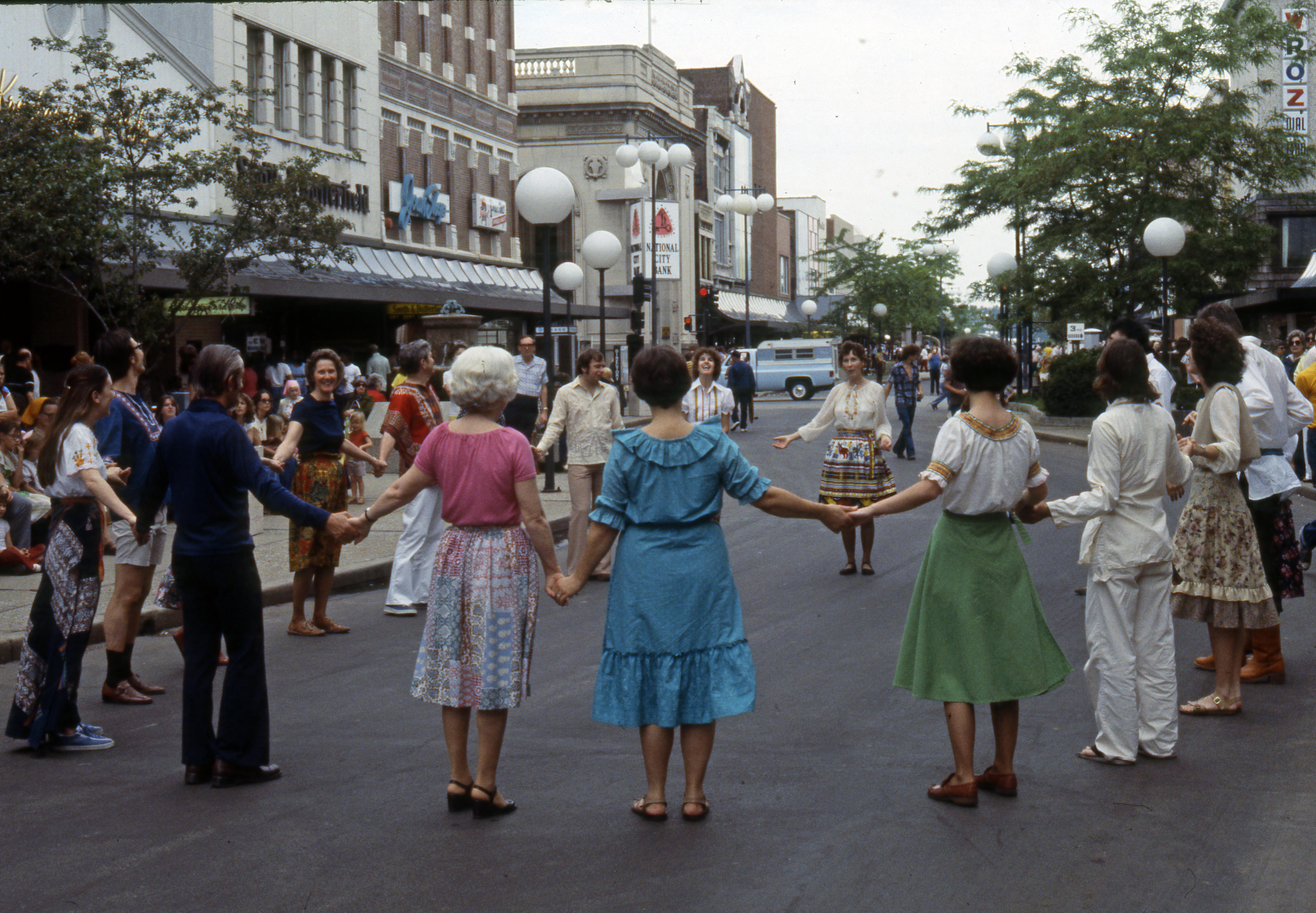 Group of dancers ready to perform at Ohio River Arts Festival on the Main St. walkway. They are in the 300 block, in front of Smith and Butterfield at 305 Main St., the Joan Shop women's clothing at 303 Main St., Postal Instant Press at 301 Main St., and National City Bank at 227 Main St. Closed to all but pedestrian traffic in the 1960s, Main St. reopened to one way vehicular traffic in 2002.