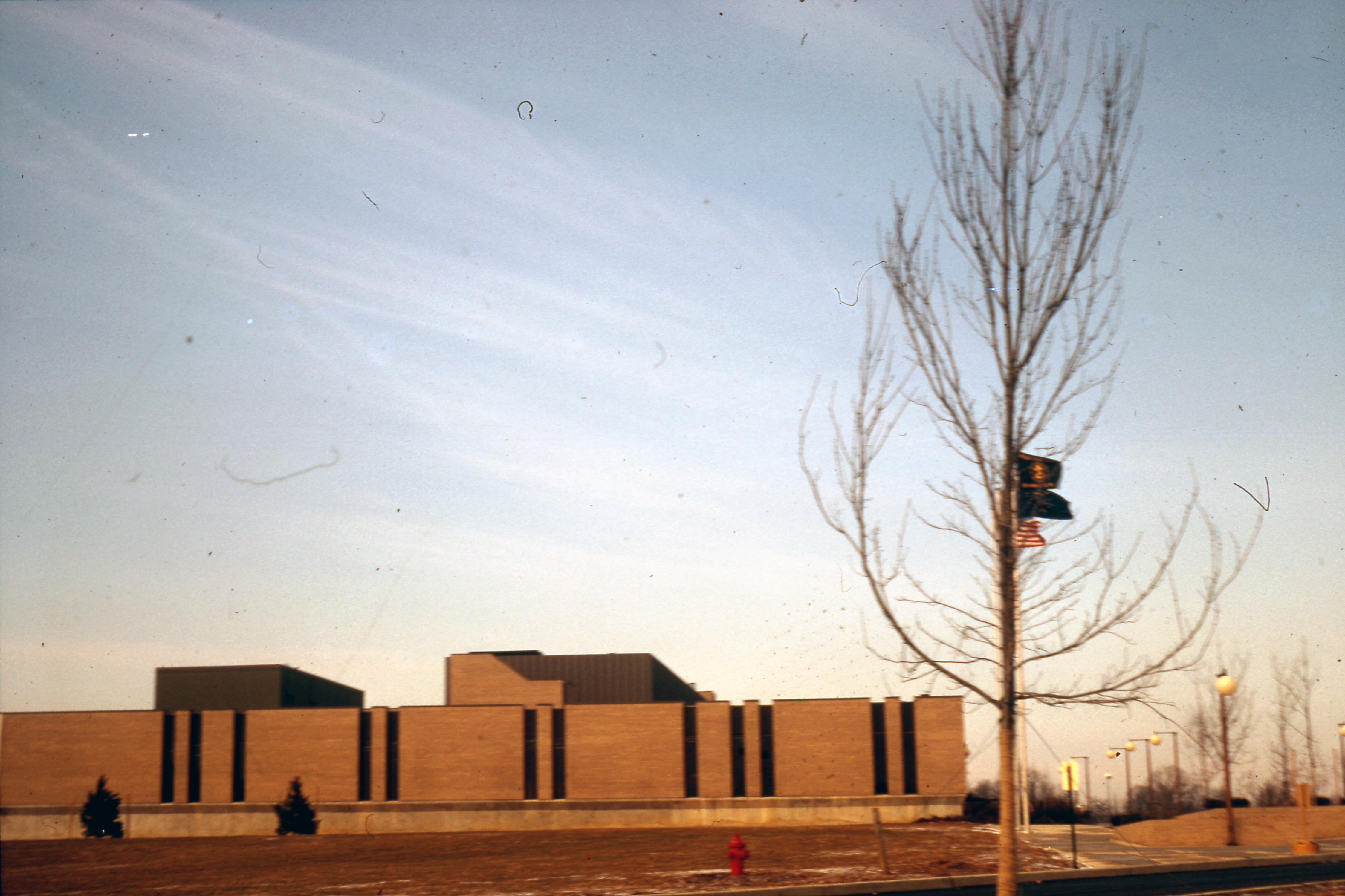 Indiana State University-Evansville (ISUE) at 8600 University Blvd. Established as a branch campus of Indiana State University in 1965, the college moved to the location depicted here, some 1400 acres, in 1969. In 1985 the university was made a separate state university, the University of Southern Indiana (USI). Byron C. Wright Administration Building was built in 1969. The buildings and the flag plaza seen here still exist.