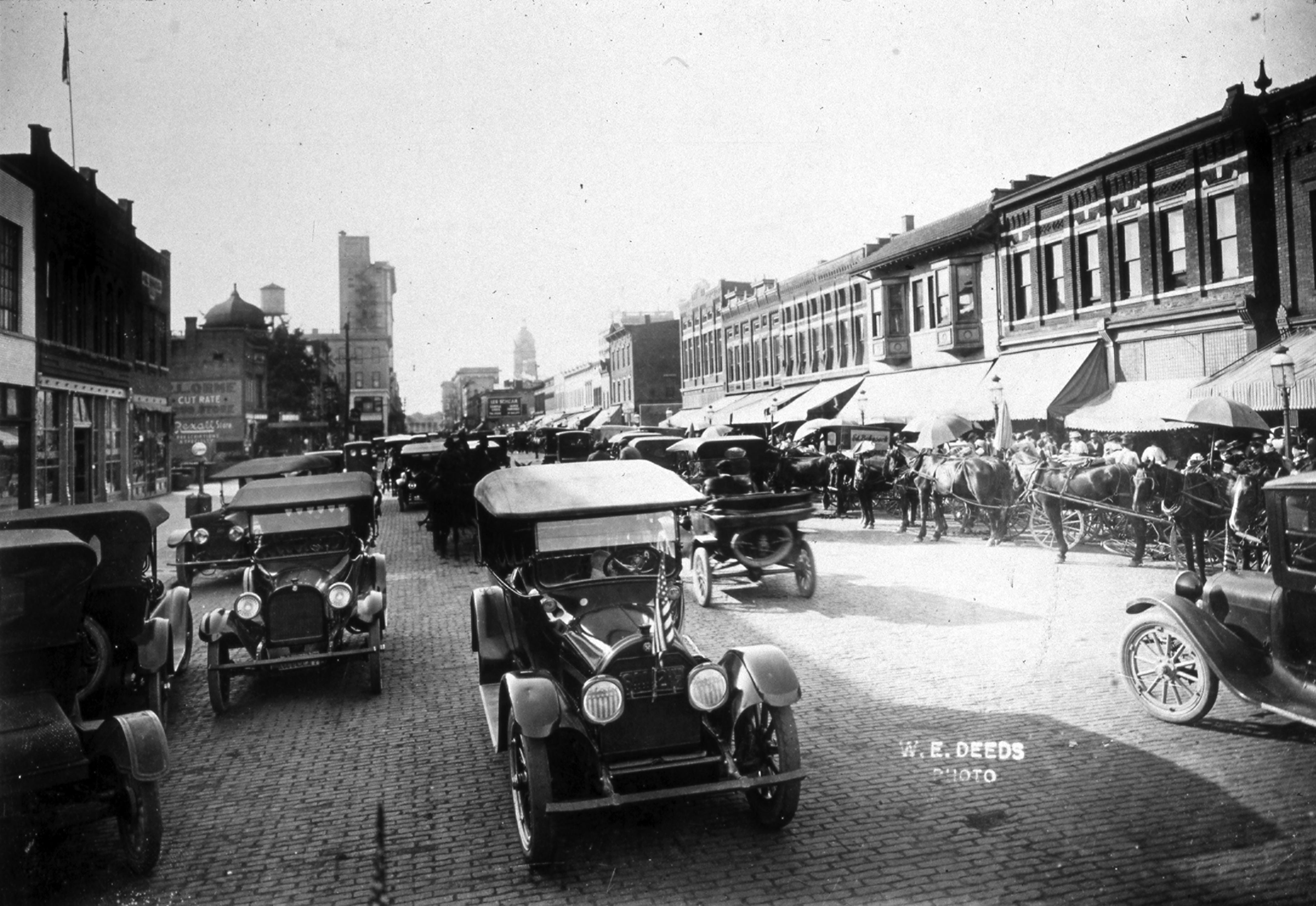 Brick street full of cars and horses and buggies, labeled as a W.E. Deeds photo. It is the 100 block of 4th St., looking west. The tall building on the left, background, is Citizens National Bank at 19 NW 4th St.. It began in Evansville in 1874 at a 1st St. location, and moved to a Main St. location in 1884 after consolidation with 2 other banks. It moved to this location in 1916 and at 10 stories tall, was the first "skyscraper." After the bank moved out in 1959, this eventually became the Hilliard Lyons building. It stood vacant after Hilliard Lyons left in 2007 until it became luxury apartments in 2012. It was also known as the Southern Securities building. Just visible in the right background is the cupola of the Old Vanderburgh County Courthouse, a Beaux Arts structure was designed by Henry Wolters of Louisville, KY. Construction began in 1888 and was completed by 1890, with offices moving in early in 1891. It occupies the block bounded by 4th, Vine, 5th, and Court streets, an area that was once a turnaround basin for the Wabash and Erie Canal. The building still stands, although it has not served as a courthouse since 1969. Today, most of the buildings just visible on the left, closest to the camera, still exist, while virtually none, maybe none, of those on the right do.