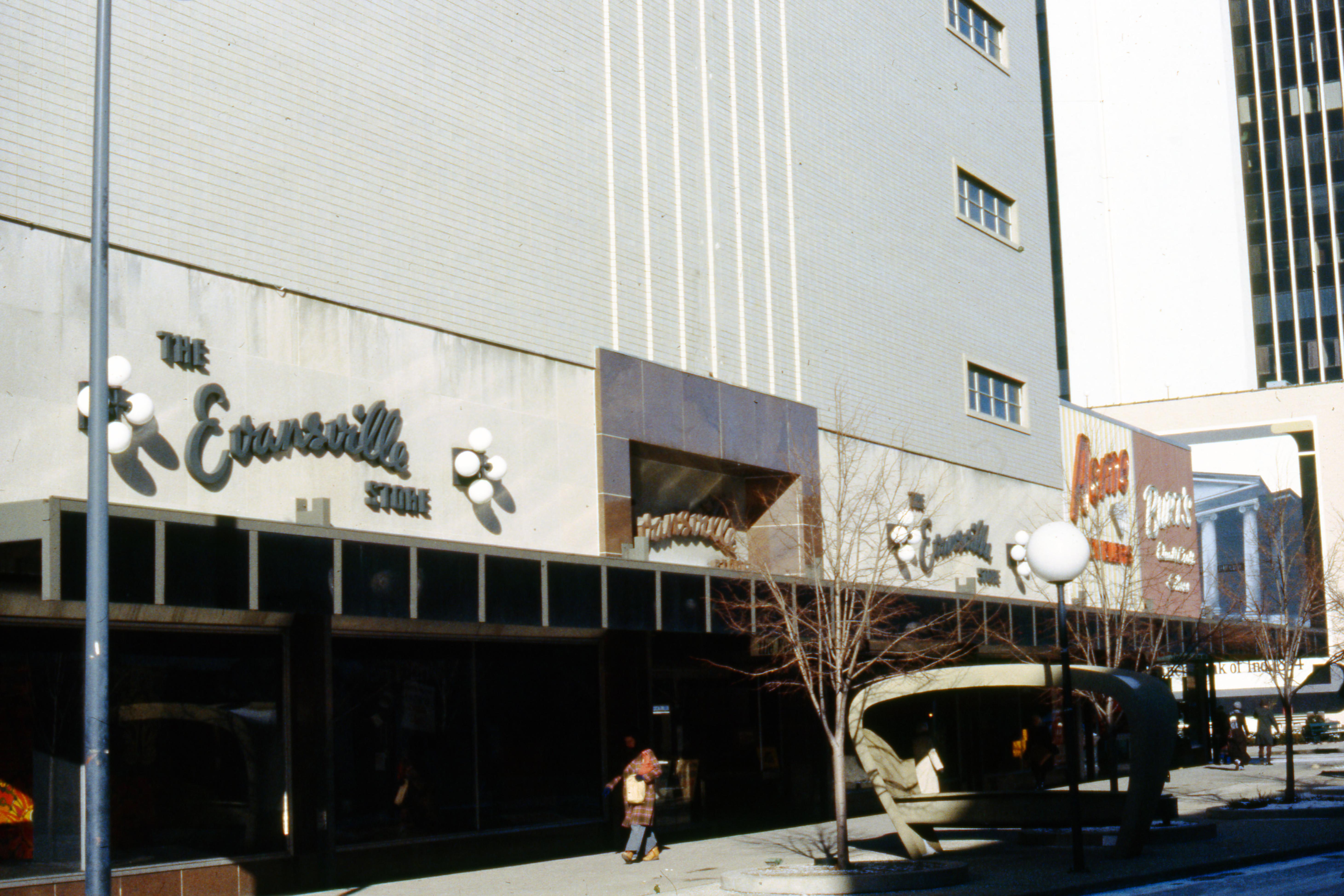 From left: The Evansville Store at 318 Main St., Acme Jewelers at 328 Main St., and Burt's Shoes at 330 Main St. In terms of dating this photograph, the Evansville Store was at this address in 1976 but not in 1979. It is thought that these buildings still exist, but the fascades have been changed to the extent that they are not identifiable. Closed to all but pedestrian traffic in the 1960s, Main St. reopened to one way vehicular traffic in 2002. SEE MSS 184-0219 for the buildings just to the left of this.