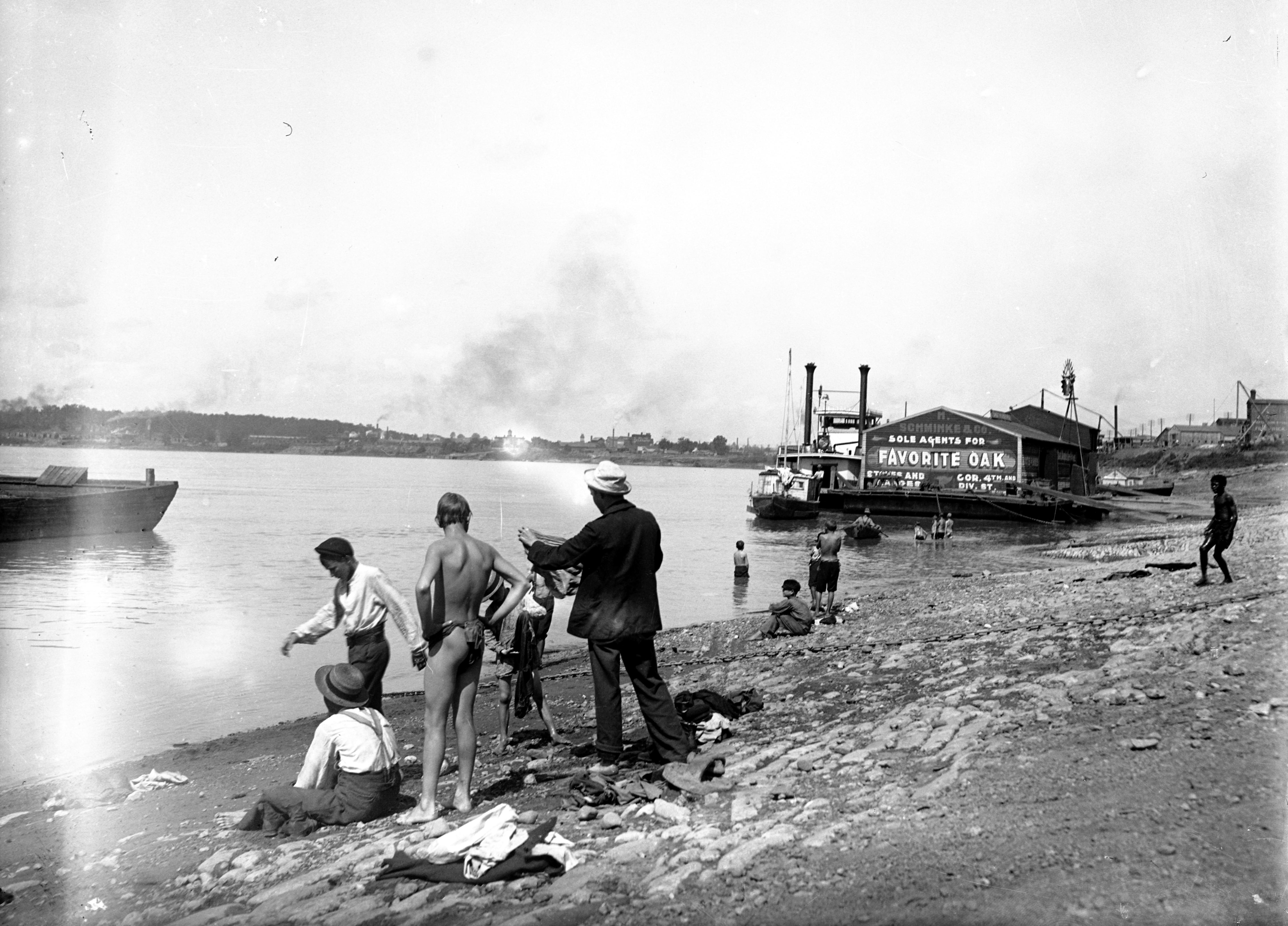 Men and boys swimming in the Ohio River. Near them is a paddlewheeler moored to a barge for H. Schminke & Co., manufacturers and dealers for stoves, ranges, warm air furnaces, tin, copper, and sheet-iron ware, and tin and slate roofing. According to the sign on the barge, they were the sold agents for Favorite Oak, a brand of stoves, and the business itself was located at the corner of 4th St. and Division St. (SEE ALSO MSS 264-2938 and 2949)