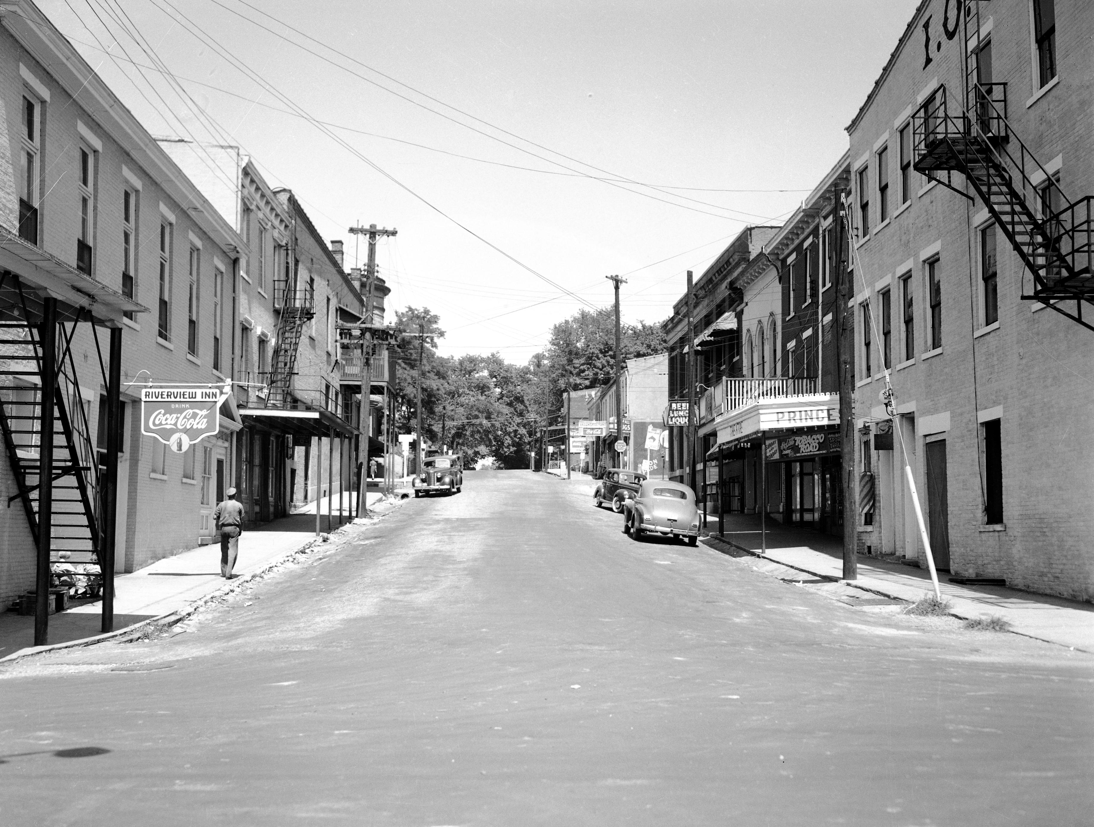 State St., looking from Water St. towards Jennings St. (The Ohio River is beyond/before the foreground in this photograph.) On the left is the Riverview Inn, and on the right the Princess Theatre, a luncheonette, a drugstore, and Brown's Food Market. The theatre is showing Twentieth Century Fox's 1941 film, Tobacco Road.