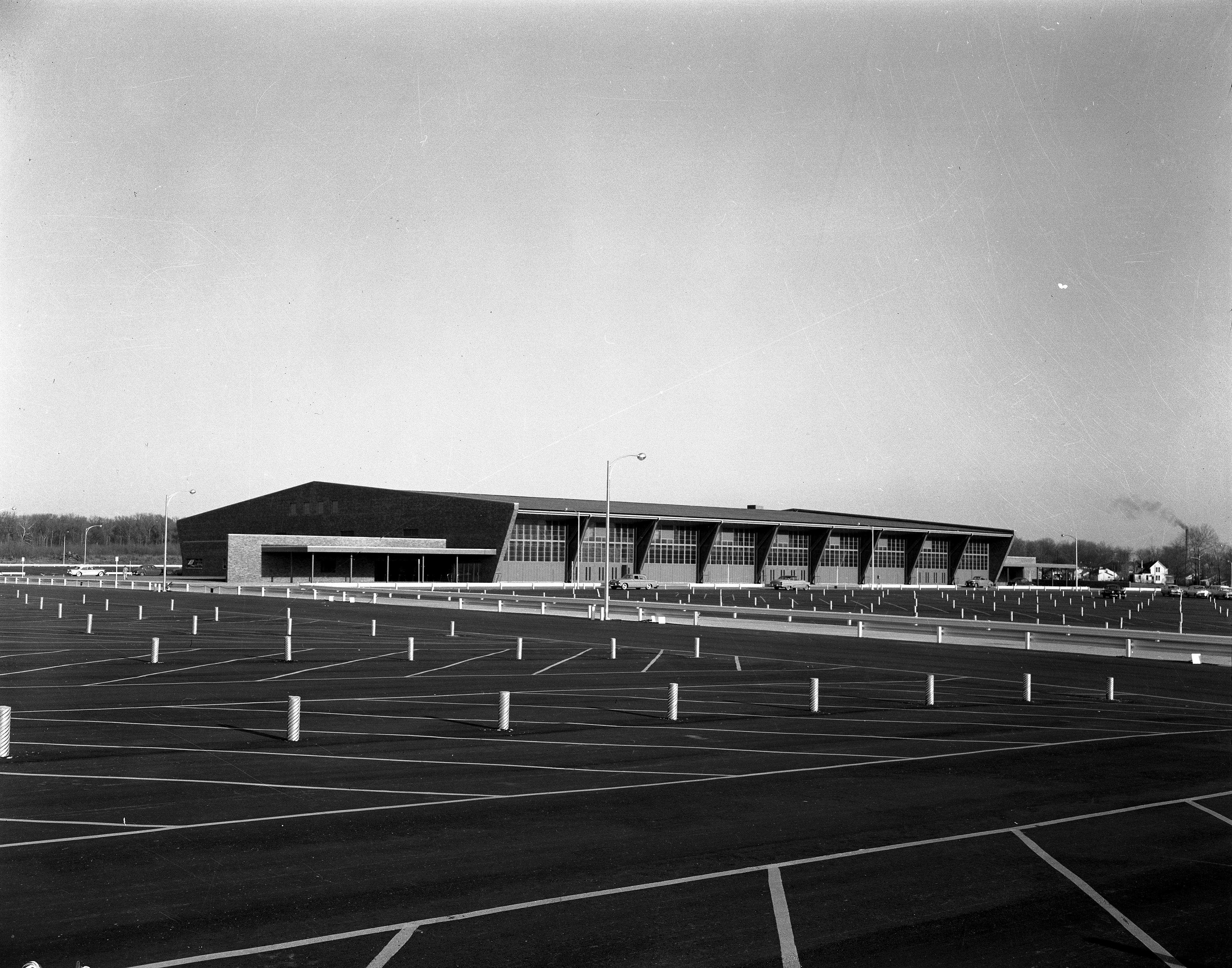Roberts Municipal Stadium, taken from across parking lot, on the NE corner of Division St. and S. Boeke Rd. The date of this photograph (November 1956) puts it very shortly after the facility opened. (See also MSS 264-0440)