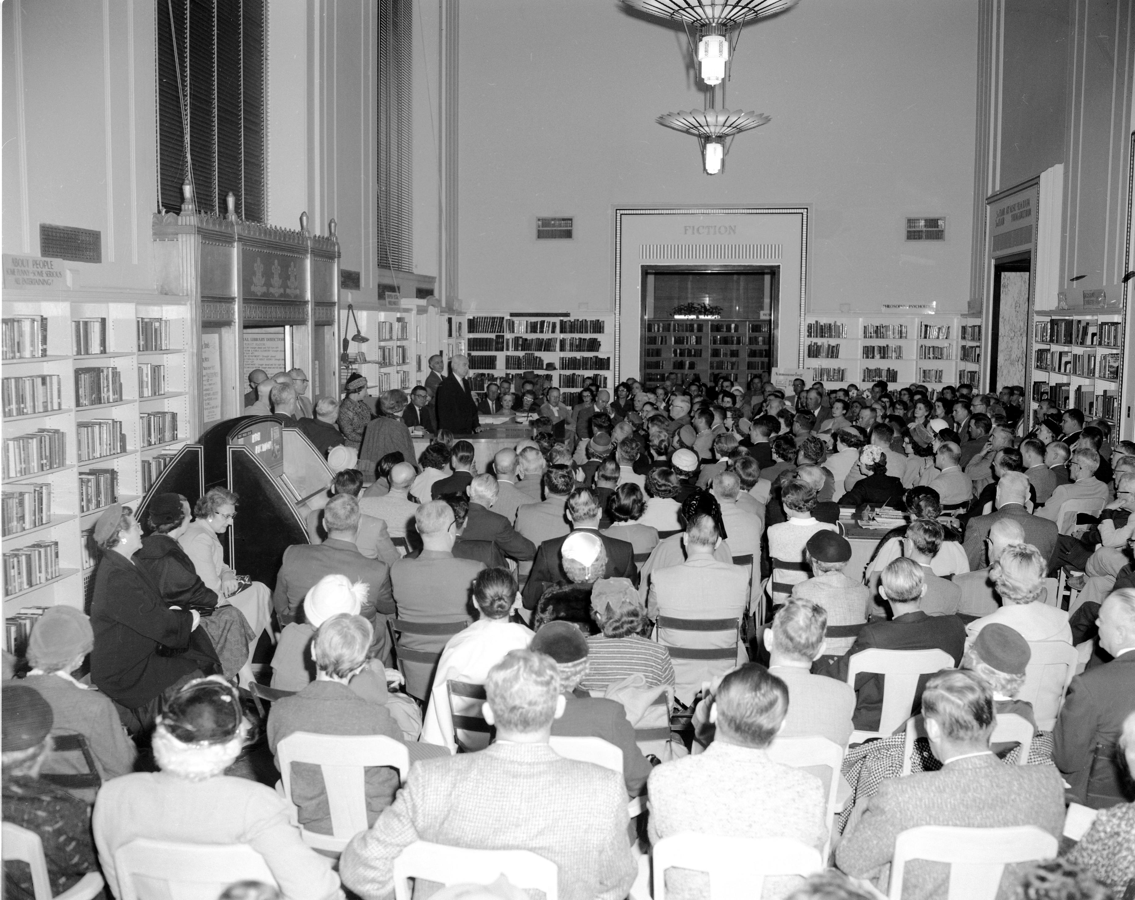 Harry O. France lecture at Central Library at 22 SE 5th St. Looking from behind room full of seated people at man standing behind desk near door. Taken from opposite side of room from MSS 264-0100.