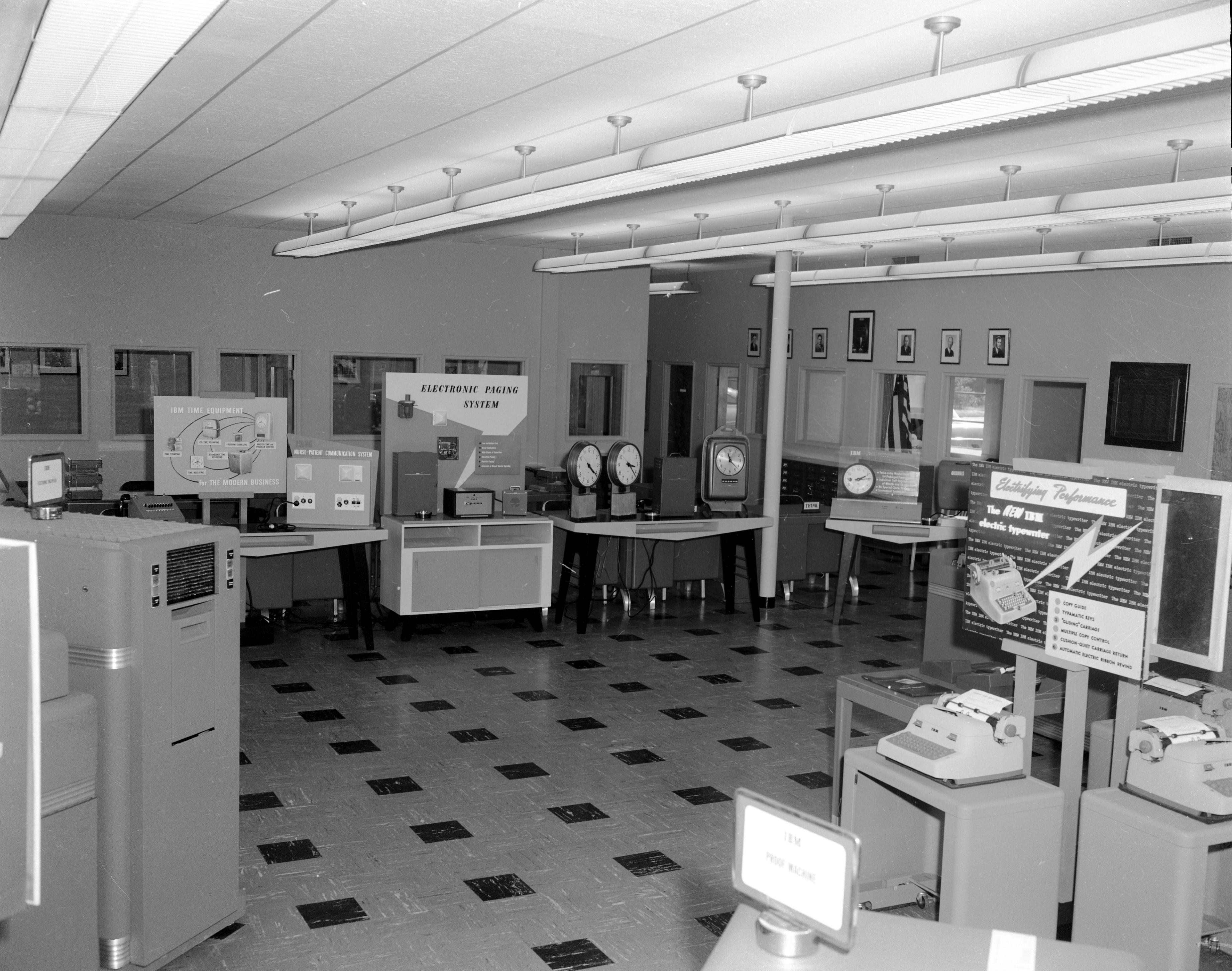 IBM (International Business Machines)building at 423 N. Main St., interior view with electric typewriters, electronic time equipment, and electronic paging system.