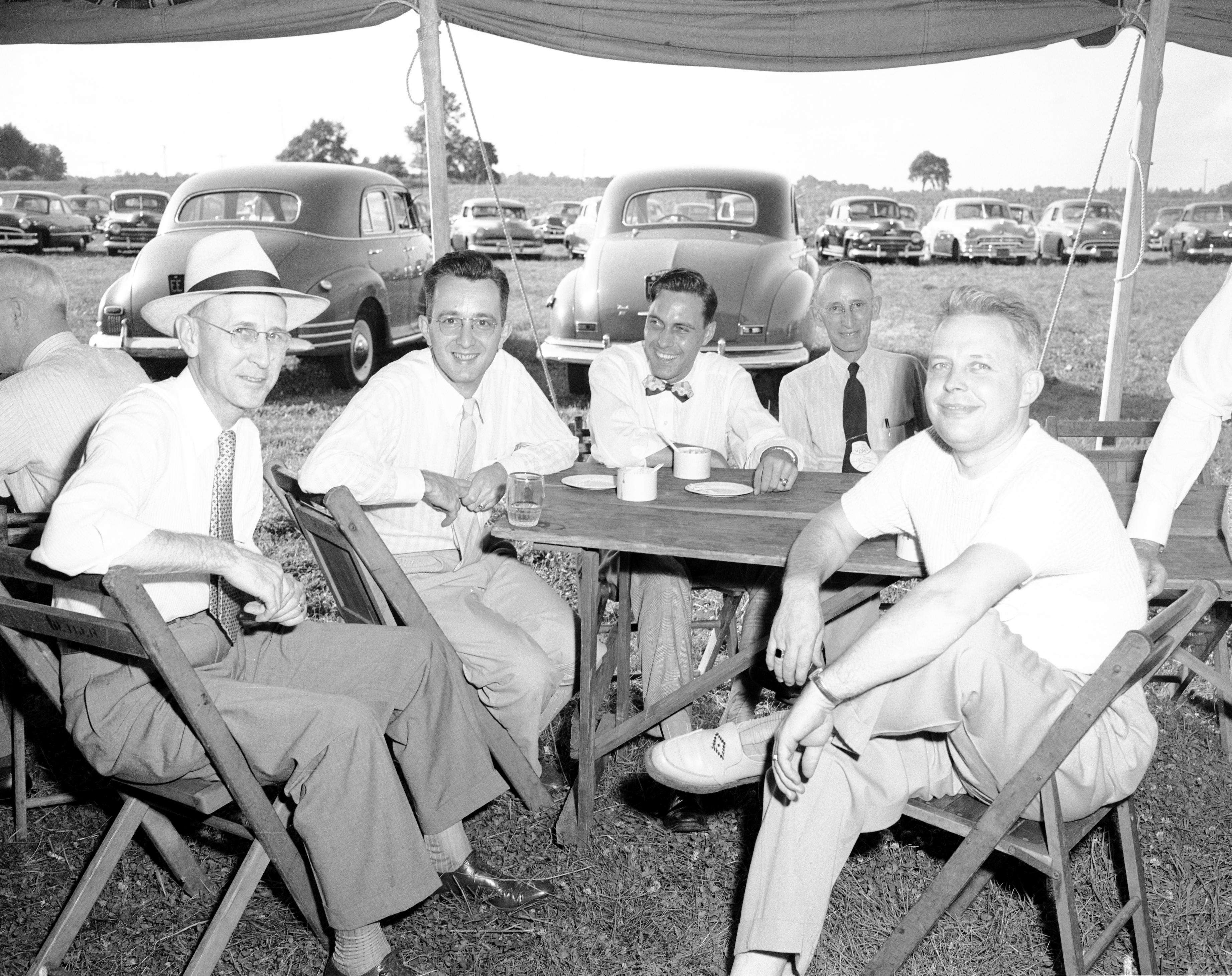 Five men gathered around a picnic table under a tent at the bankers' picnic, hosted by Old National Bank, held at the Servel Inc. picnic grounds, with cars parked in the field behind them