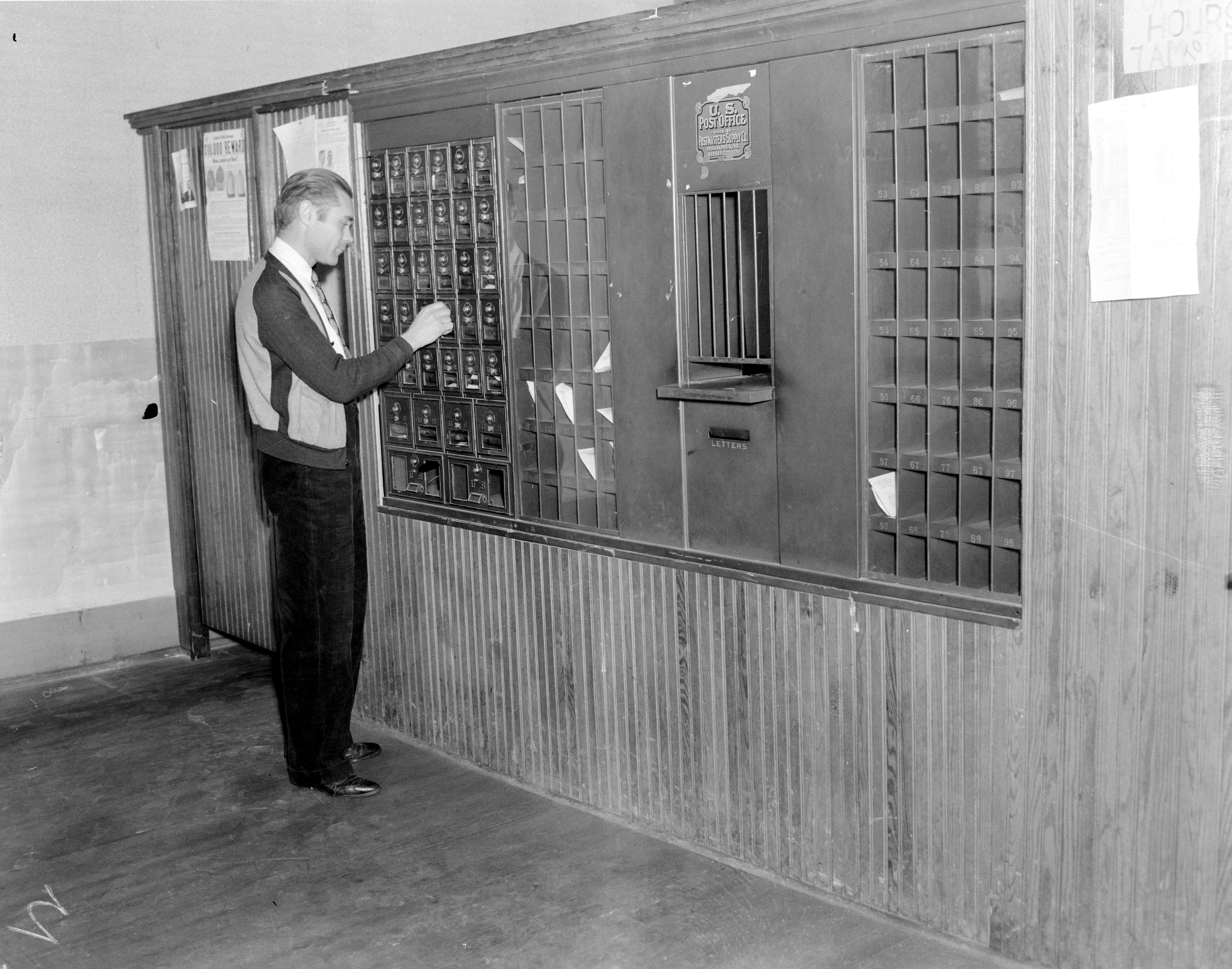 Identified as Orville Schaaf in the post office, working the combination on a locked mailbox