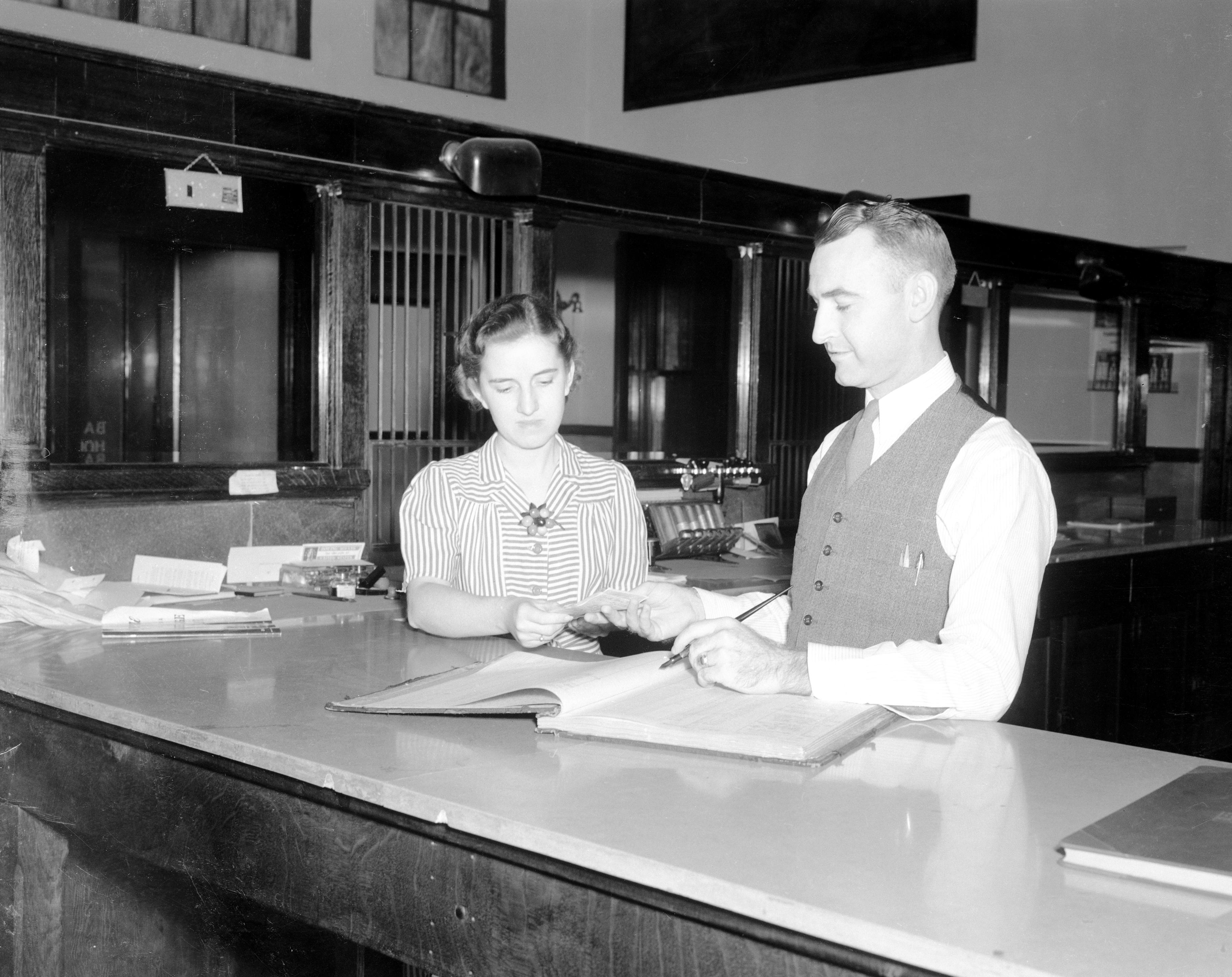 Unidentified man and woman at a counter in a bank, posting checks to a ledger with a fountain pen