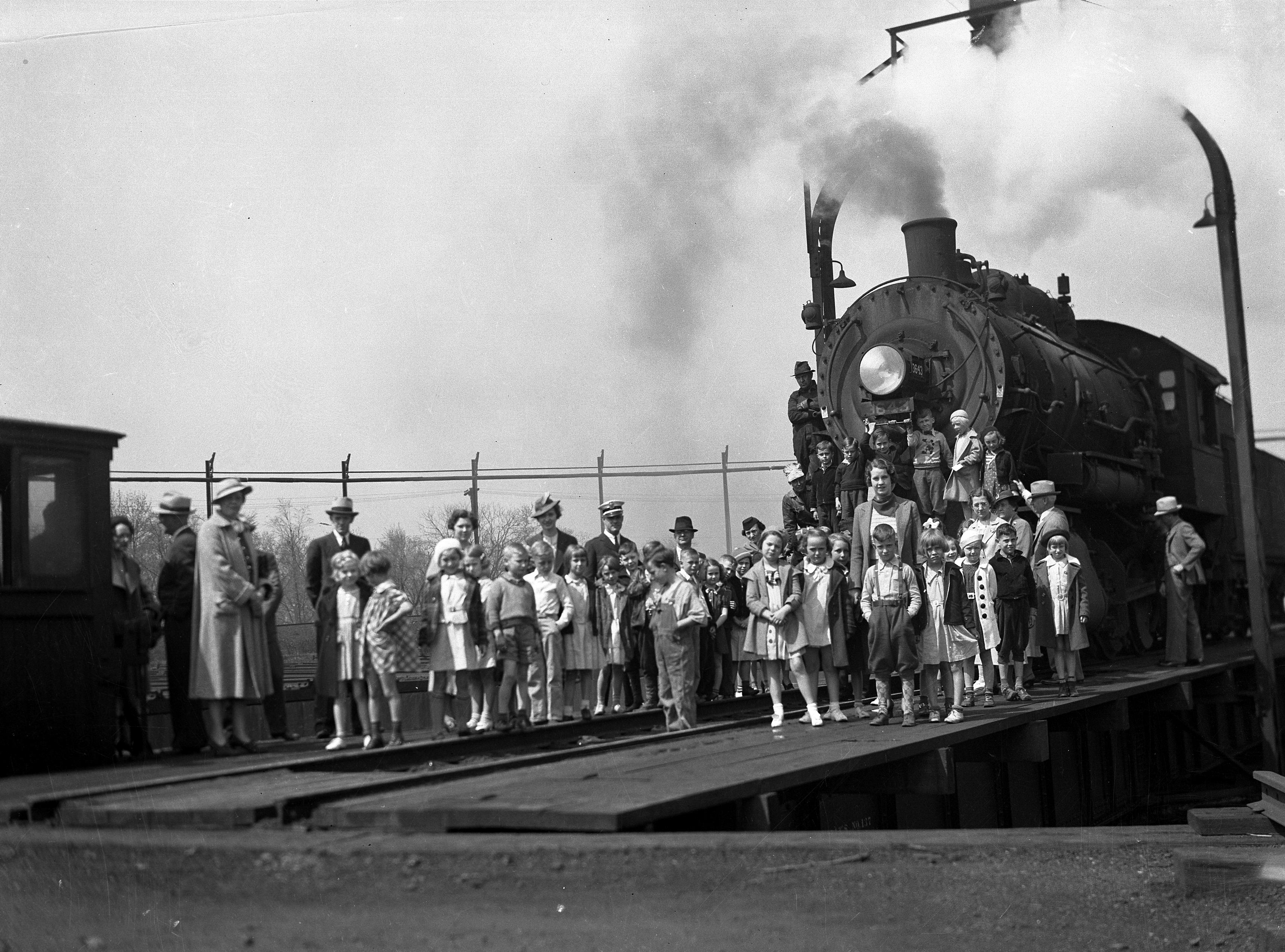 Steam engine, said to be in Sunset Park (SE Riverside Dr. south of Locust St.) with group of children and some adults on track; some were identified as Girl Scouts