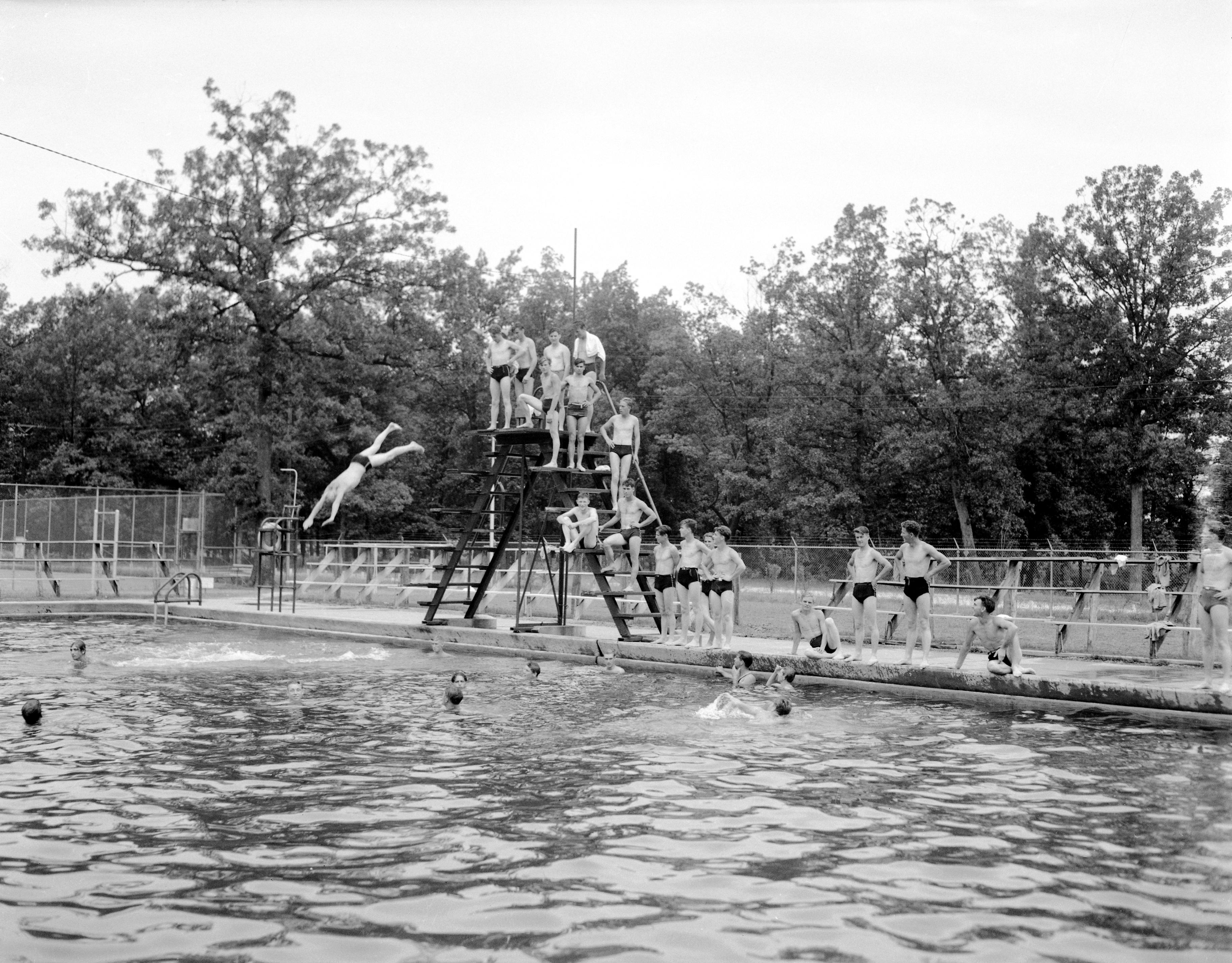 Group of teen-aged boys boys swimming, diving, and standing on the side of a swimming pool. They are all dressed alike, so this could be a swim team.