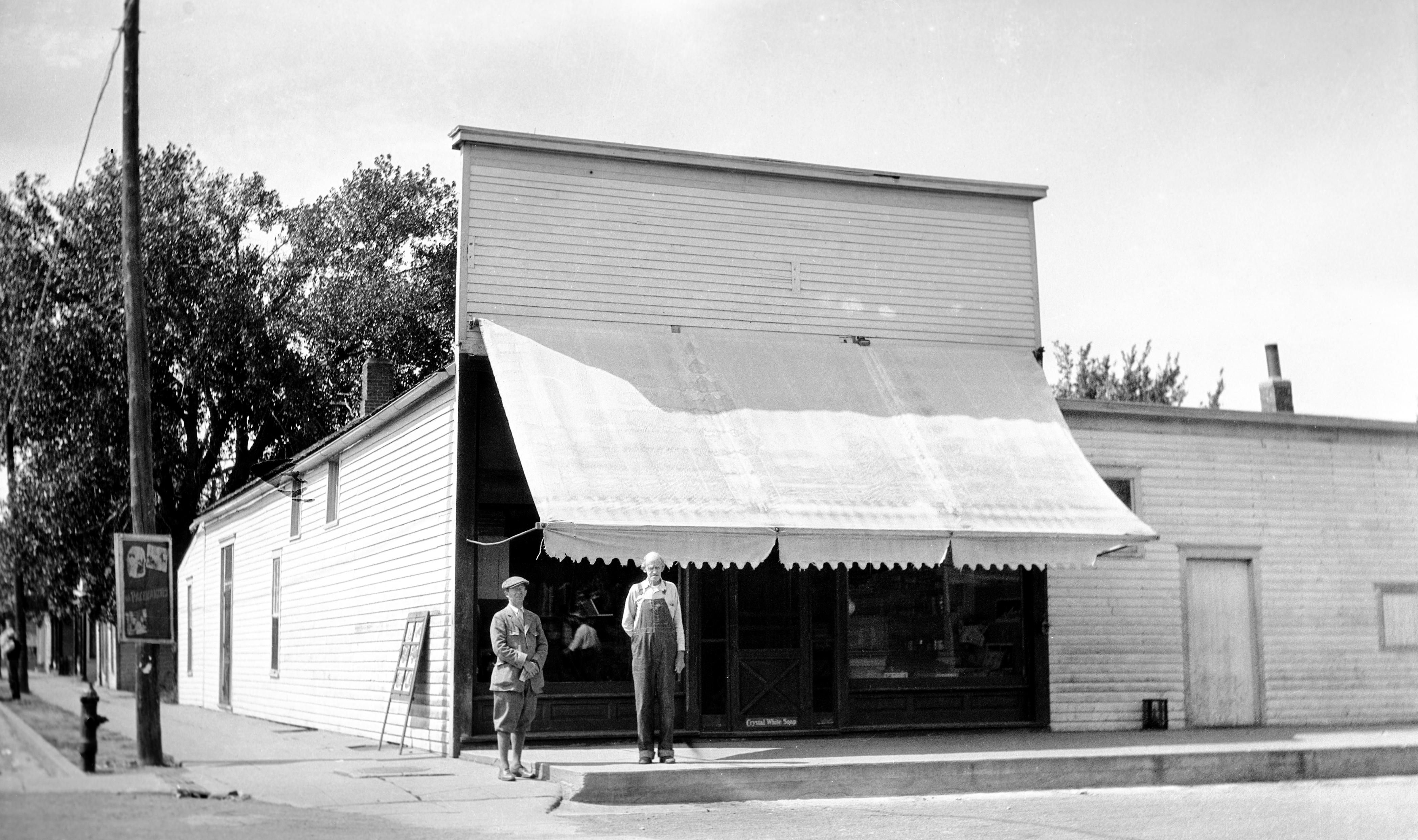 Karl Kae Knecht and another man in front of a grocery store on Main St. in Iroquois, SD. (SEE ALSO MSS 264-2774 and MSS 264-2780) Knecht was born in the village of Iroquois in what was then Dakota Territory on December 4, 1883. He was a well known Evansville Courier cartoonist.