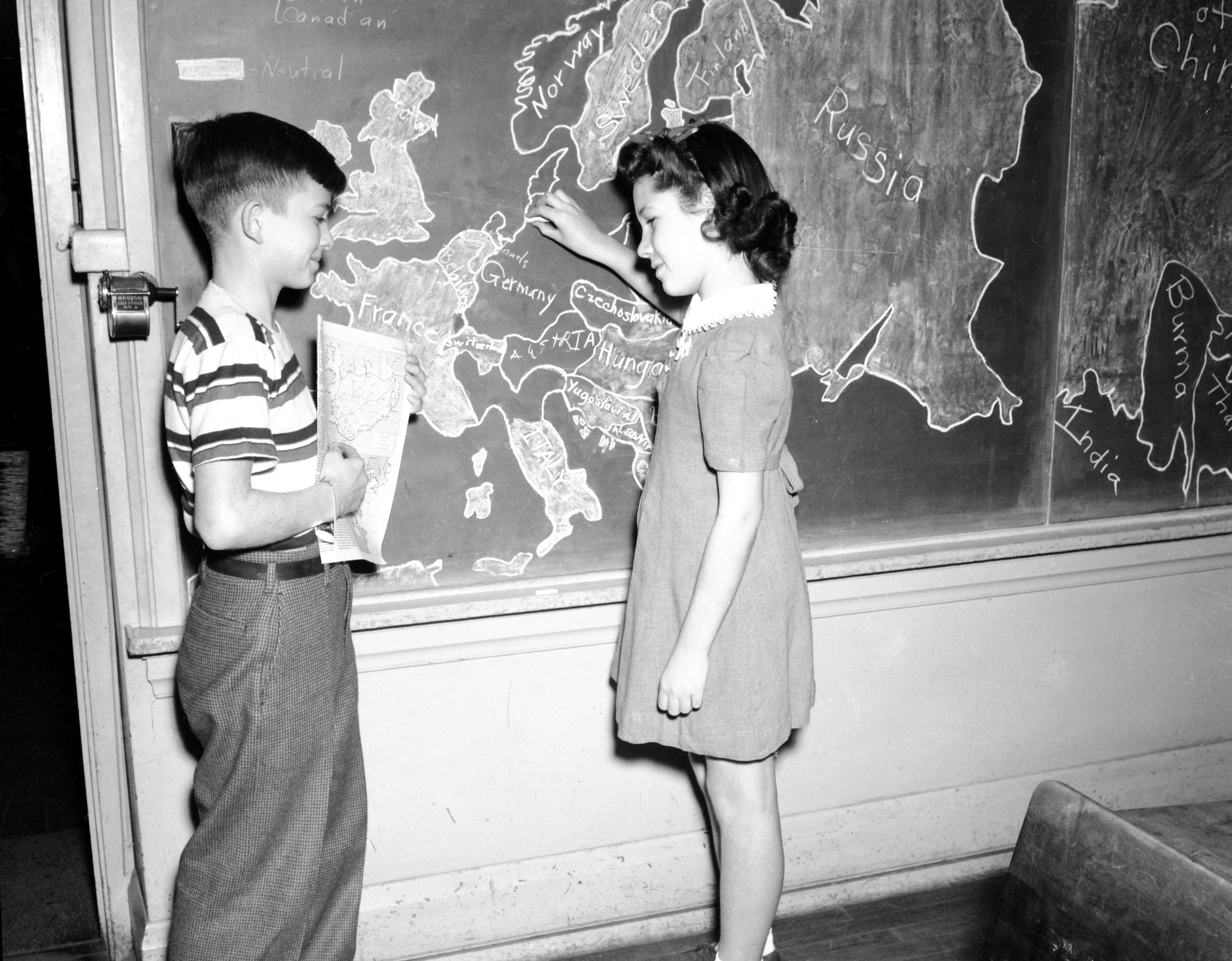 Young boy and girl (elementary school aged) at a blackboard. The boy is holding a map of Europe and the girl is writing the names of the countries outlined on the blackboard. Some countries are shaded in and marked as neutral.
