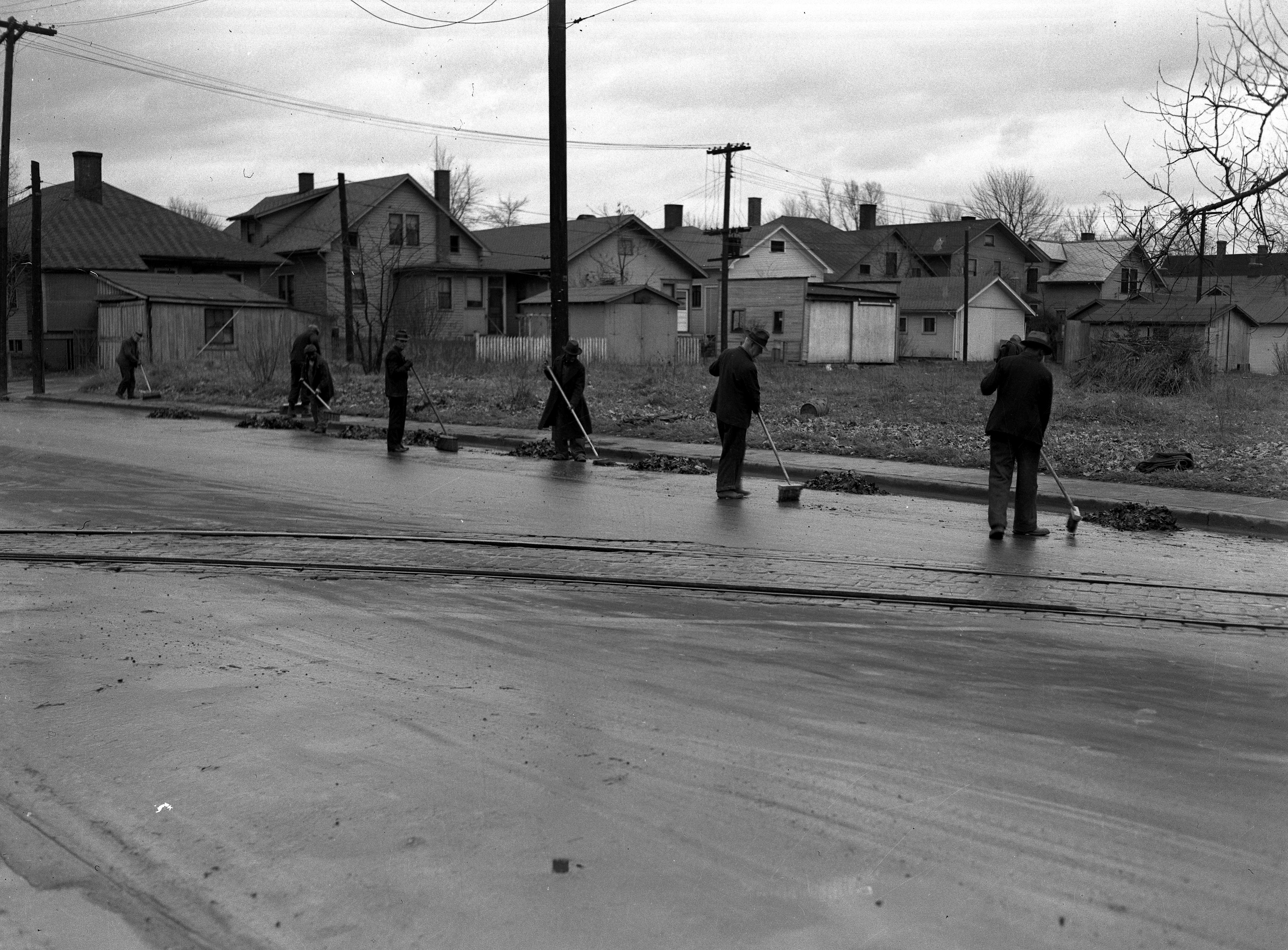 Seven men sweeping street in area said to be Lodge Ave. near Bayard Park Dr. Frame homes and other buildings in background. Trolley tracks cross the street.