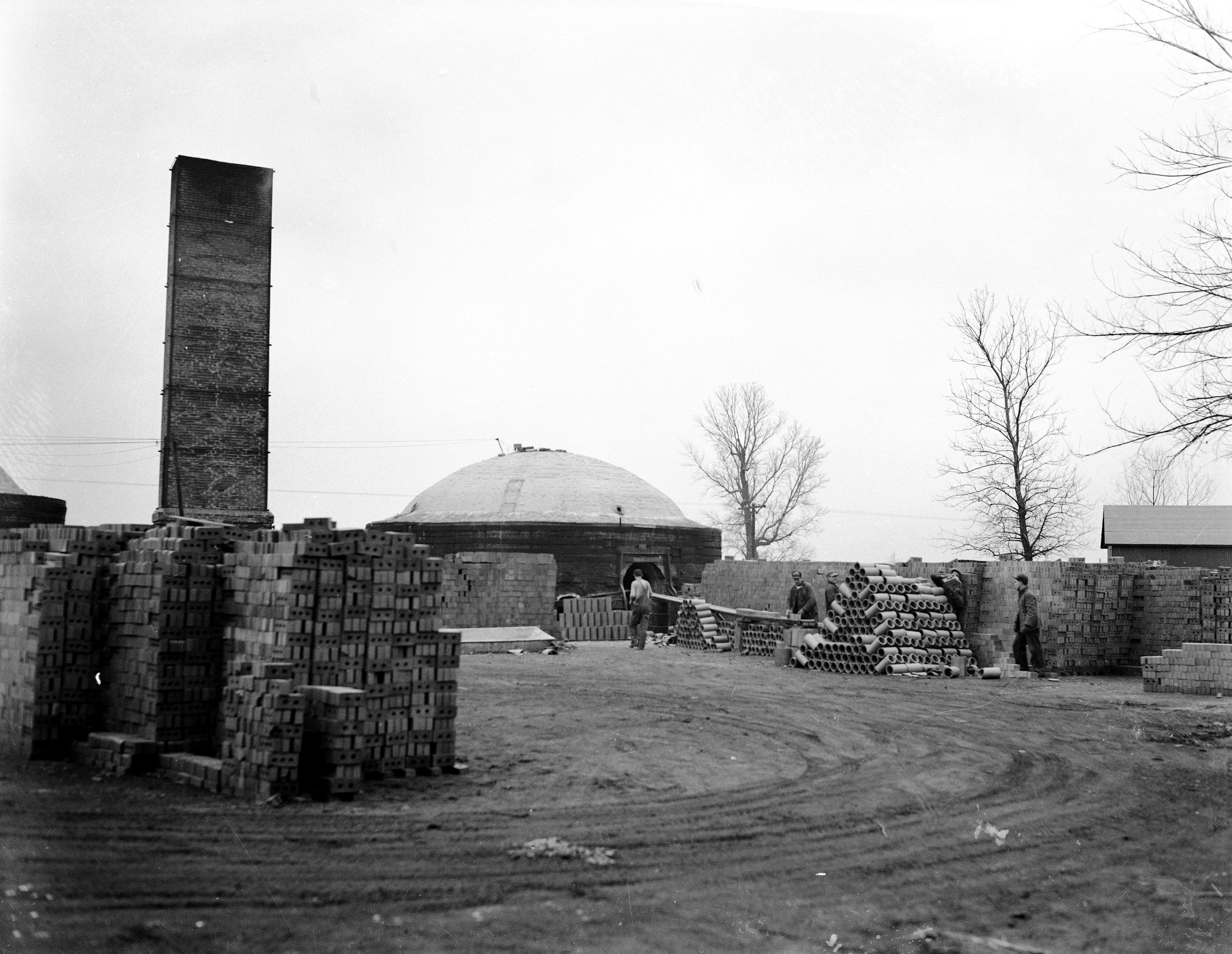 Factory making clay bricks, pipes/tiles. Stacks of bricks and pipes/tiles are seen, as well as a conveyer leading into a kiln. (NOTE: SEE ALSO MSS 264-1917, MSS 264-1930, MSS 2641-1933, MSS 264-1936. )