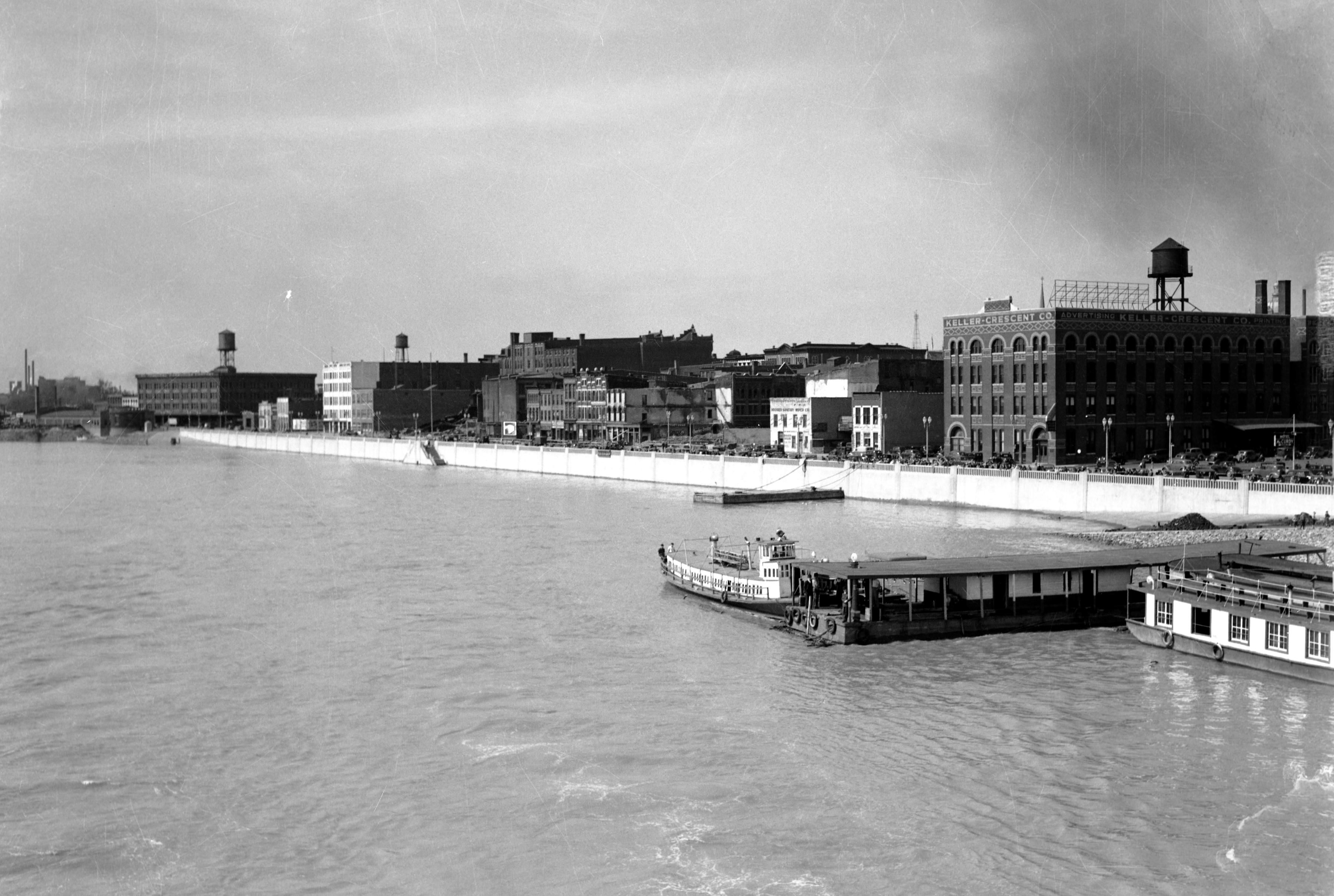 Riverside Dr. area, as seen from the Ohio River, with Hoosier Sanitary Wiper Co. at 10-12 SE Riverside Dr. and Keller-Crescent Printing & Engraving Co. at 216-220 Locust St. Several boats are tied up to a floating dock.