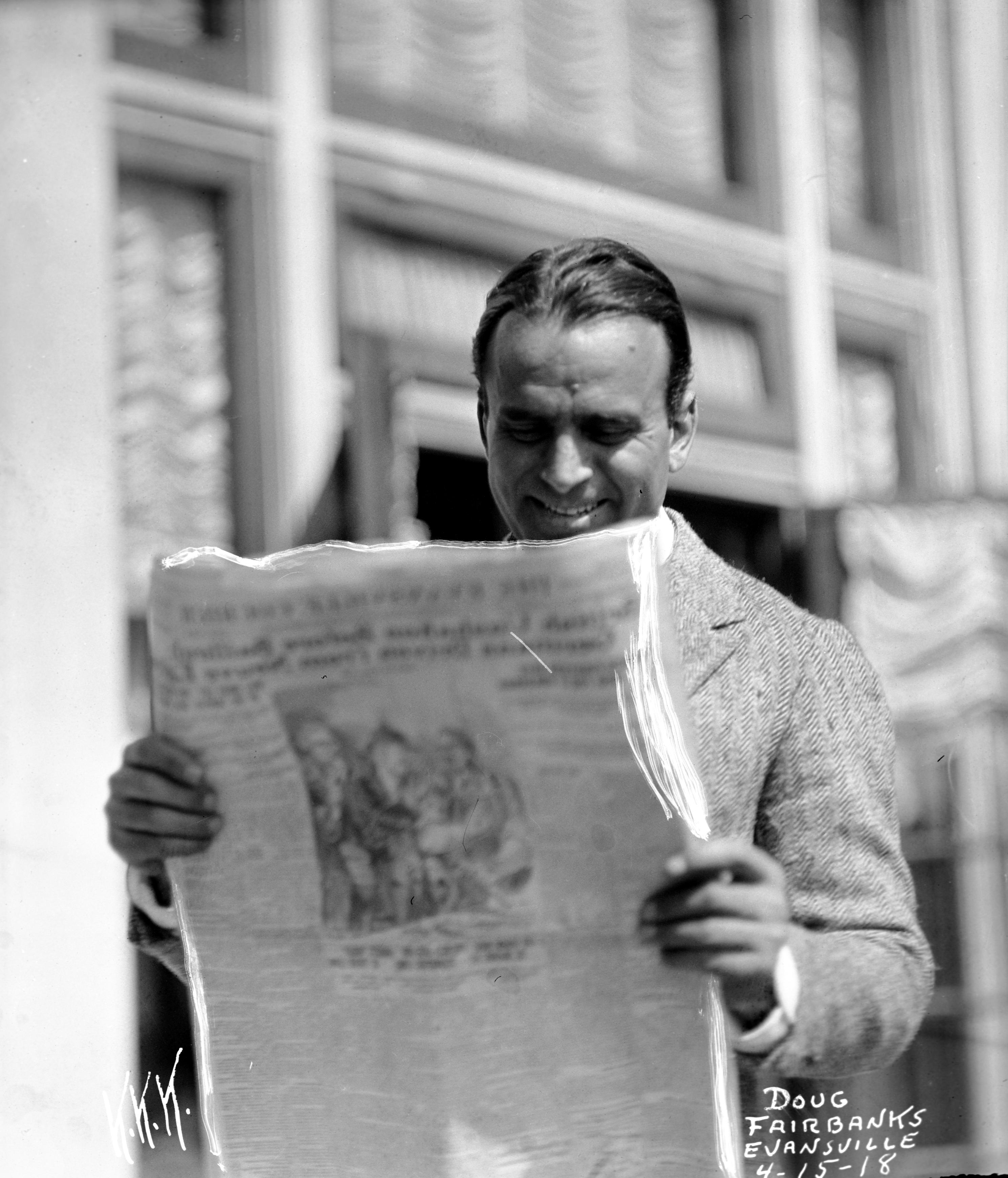 Douglas Fairbanks, reading a newspaper, said to be promoting the sale of war bonds. The initials K.K.K. identify this as a photograph by Karl K. Knecht, Evansville Courier cartoonist and photographer. (SEE ALSO MSS 264-1164-1165 and MSS 264-2811-2813)