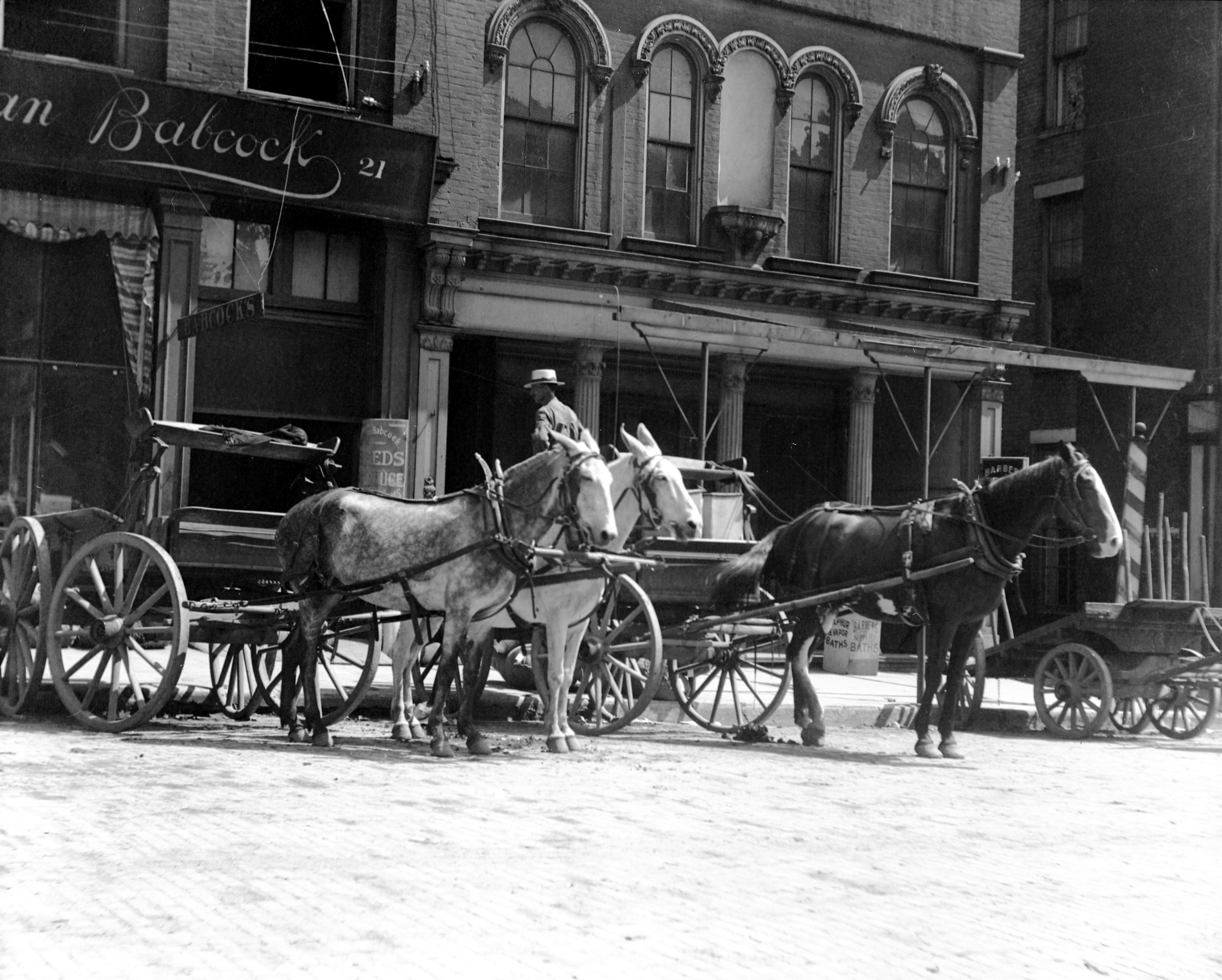 Two mules and a wagon, plus a horse and wagon, in the first block of Main St. The businesses behind are Babcock & Seitz seeds and produce at 21 Main St. and a barber shop and bath house owned by Charles Daum in the basement of 17 Main St.