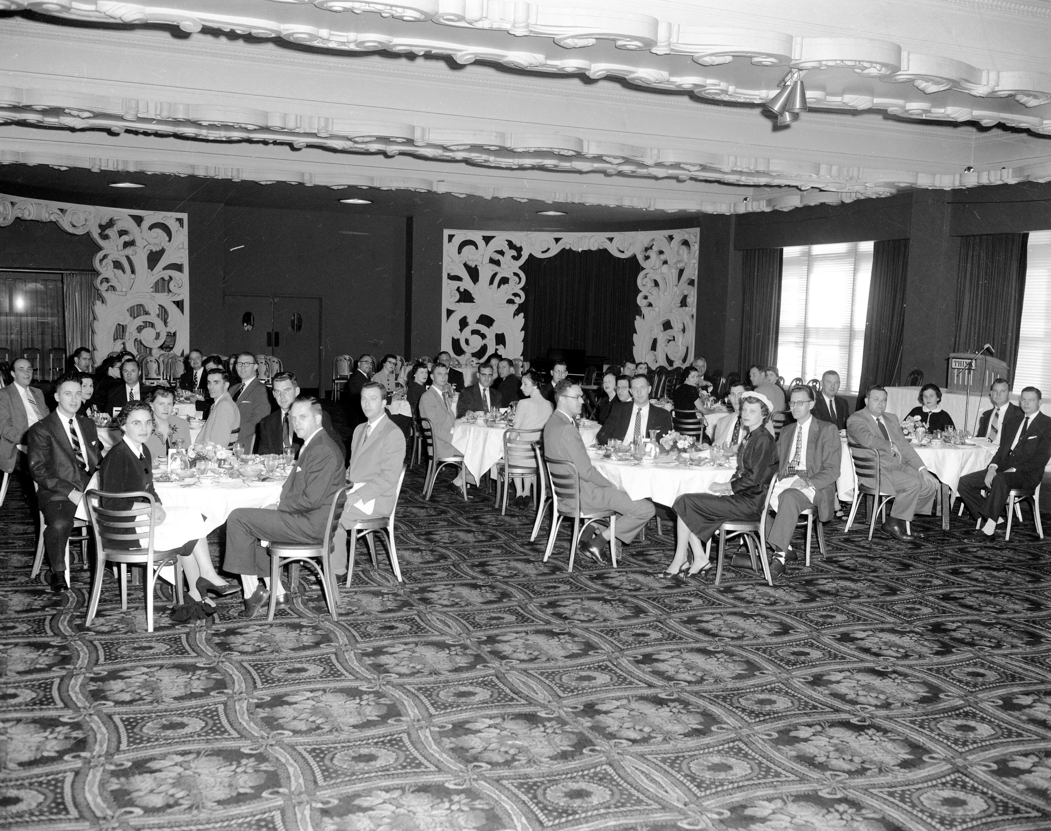 IBM employees and spouses at a dinner celebrating the opening of IBM (International Business Machines)building at 423 N. Main St. The location of this dinner is unknown.