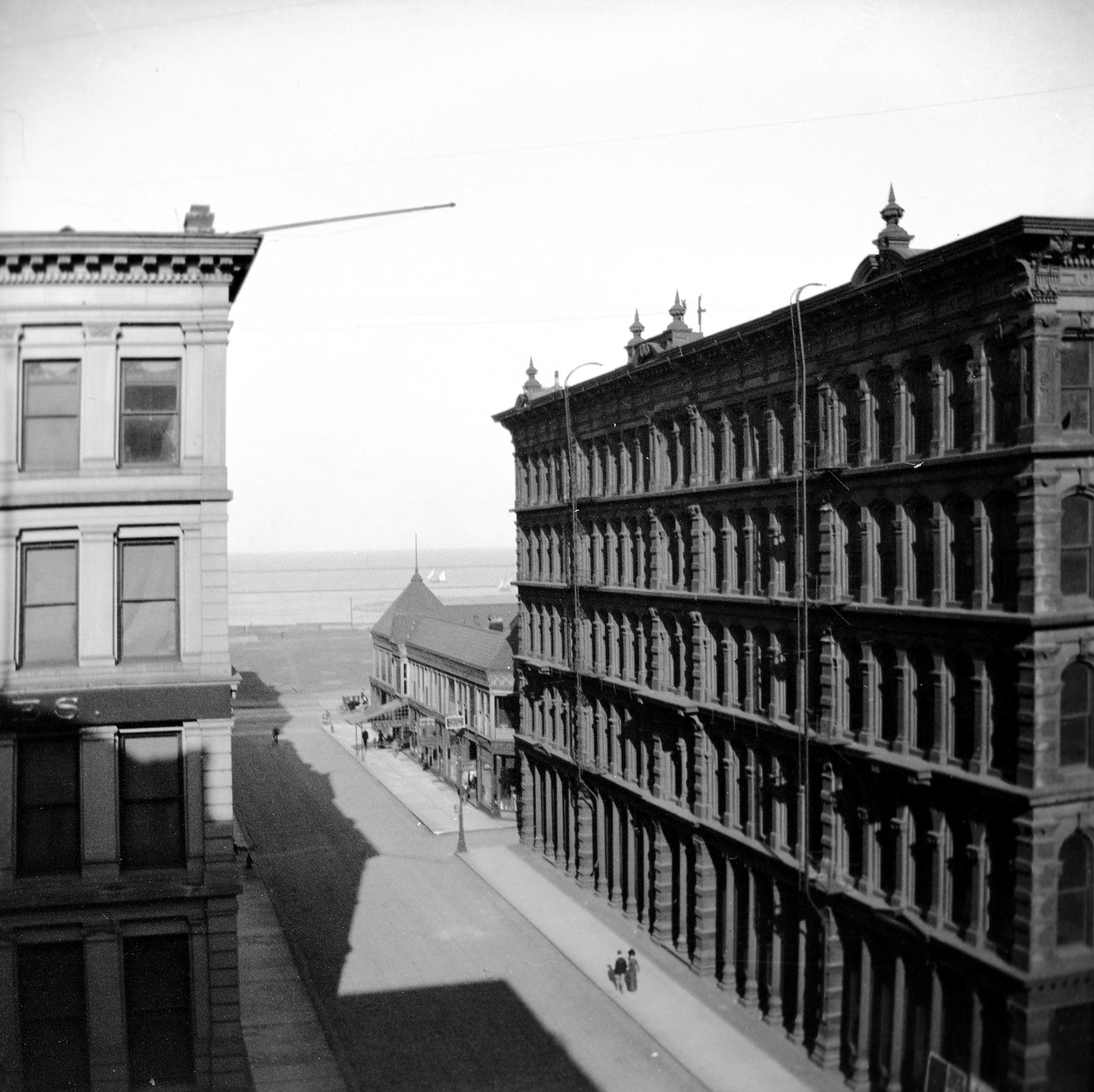 Looking down a street between 2 tall buildings, with sailboats on Lake Michigan in the background