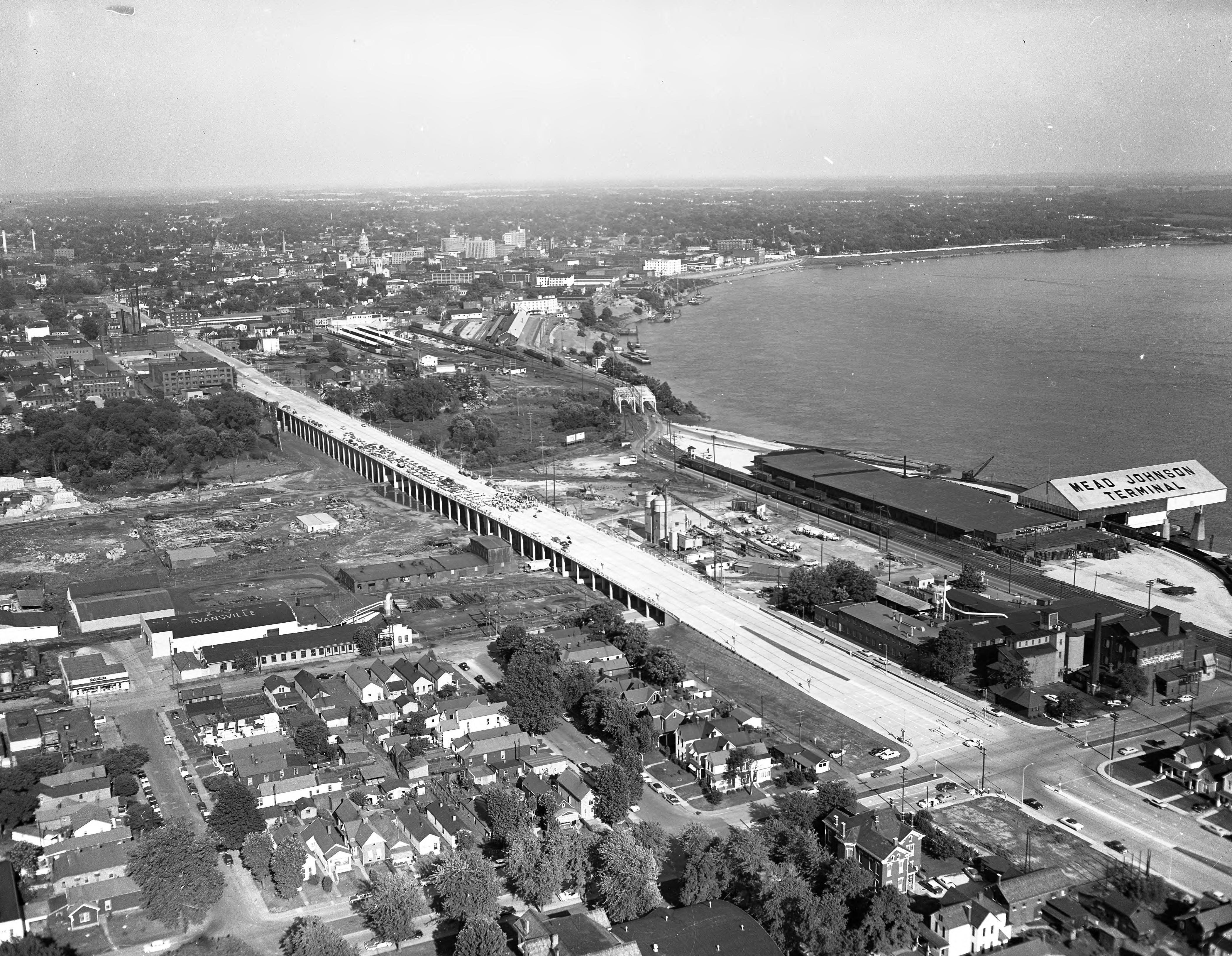 Aerial view of Pennsylvania Expressway near St. Joseph Ave. Today the main east and west traffic is handled by the Lloyd Expressway, opened in 1988 (although portions were completed long before then). Prior to this, westbound traffic (from Main St.) drove on Pennsylvania St., and eastbound (from Main St.) on Division St. The Lloyd Expressway runs much the same route, so much of both Pennsylvania and Division are now part of it. This shows the portion that runs within sight of the Ohio River.