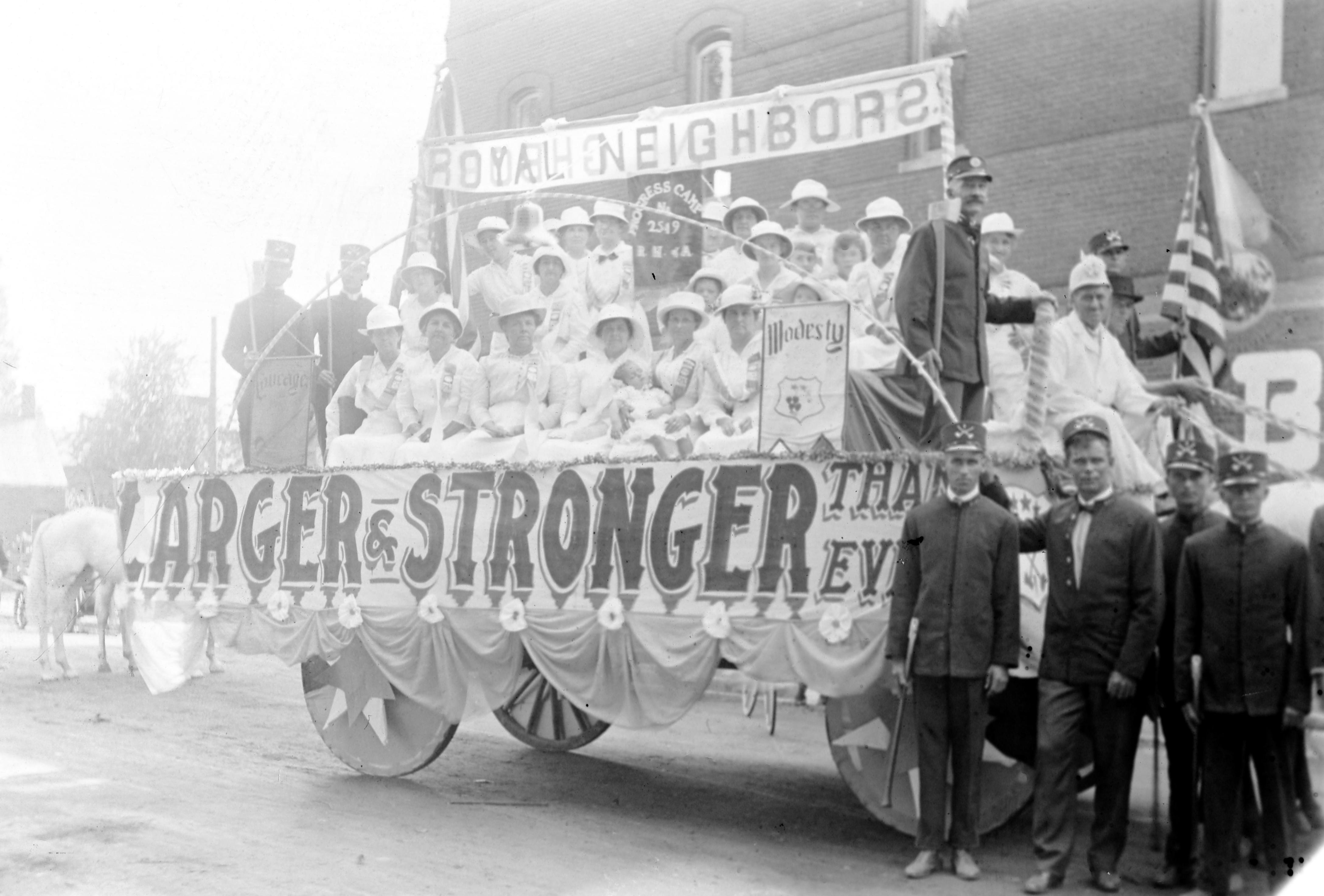 Royal Neighbors float, probably for the 1916 centennial of Mt. Vernon. Royal Neighbors of America was founded in 1895 and is one of the largest women-led life insurers in the nation. Its website says that it is a fraternal benefit society and are driven by a unique mission to insure lives, support women, and serve local communities. This organization may have had some connection with the Modern Woodman of America since the float featured men with axes.