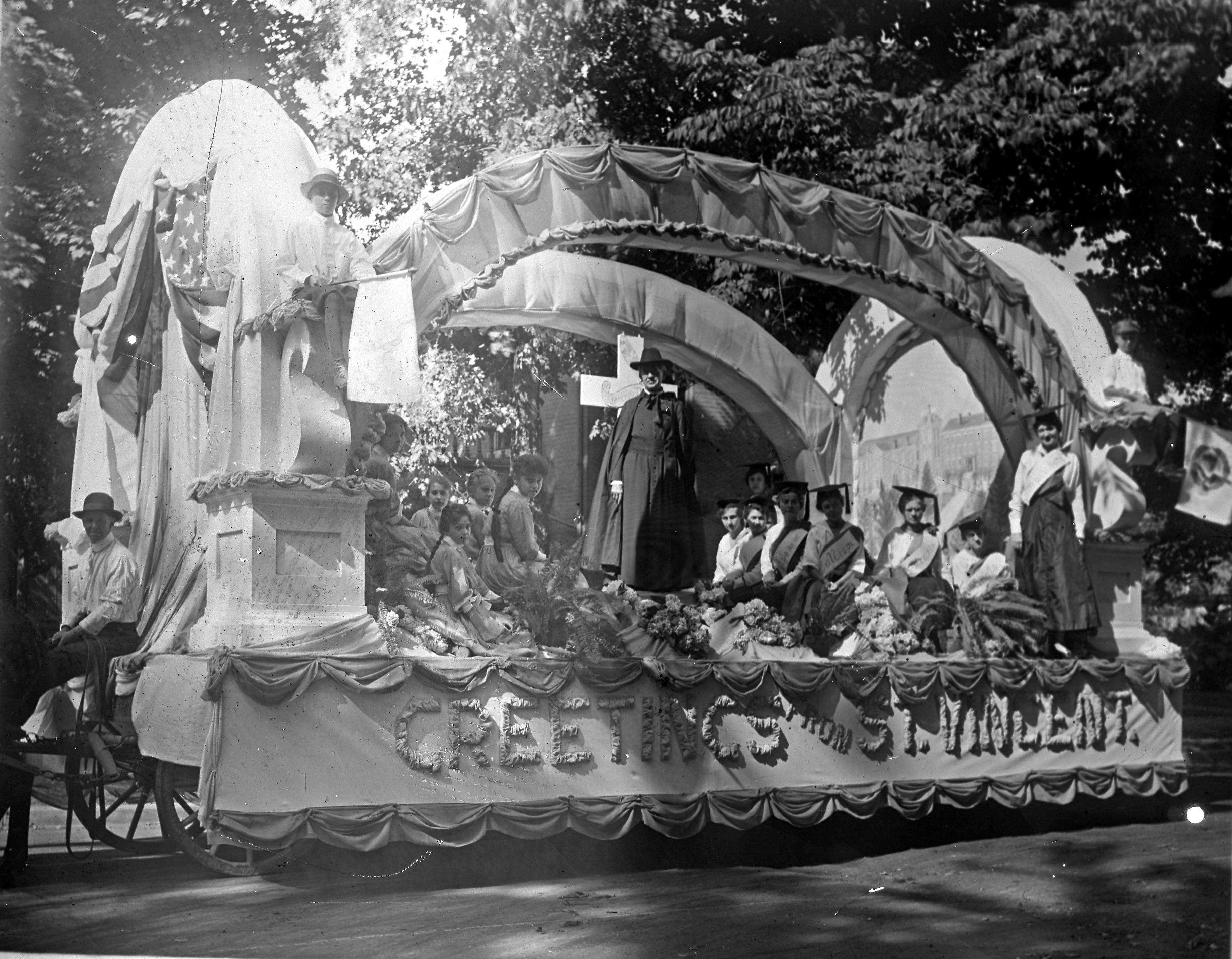 St. Vincent float, possibly for the 1916 centennial of Mt. Vernon. No further information was found about this organization--given that the young women are wearing mortarboards, it may have something to do with education.