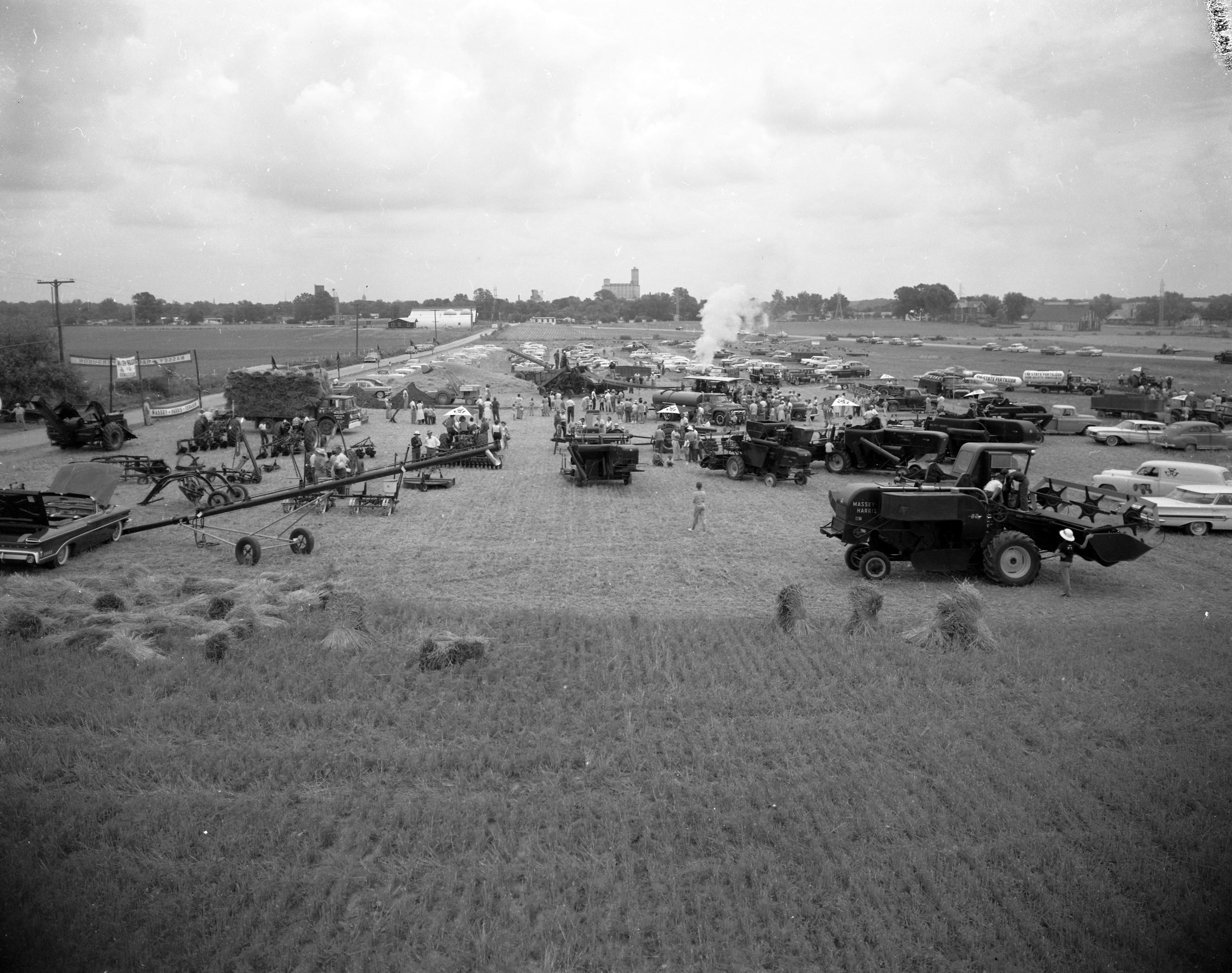 Threshing Day celebration, sponsored by Juncker Brothers. Juncker Brothers Sales and Service--this company sells equipment and conducts agricultural auctions--is located at 601 Mackey Ferry Rd. E. The location seen here is unidentified.
