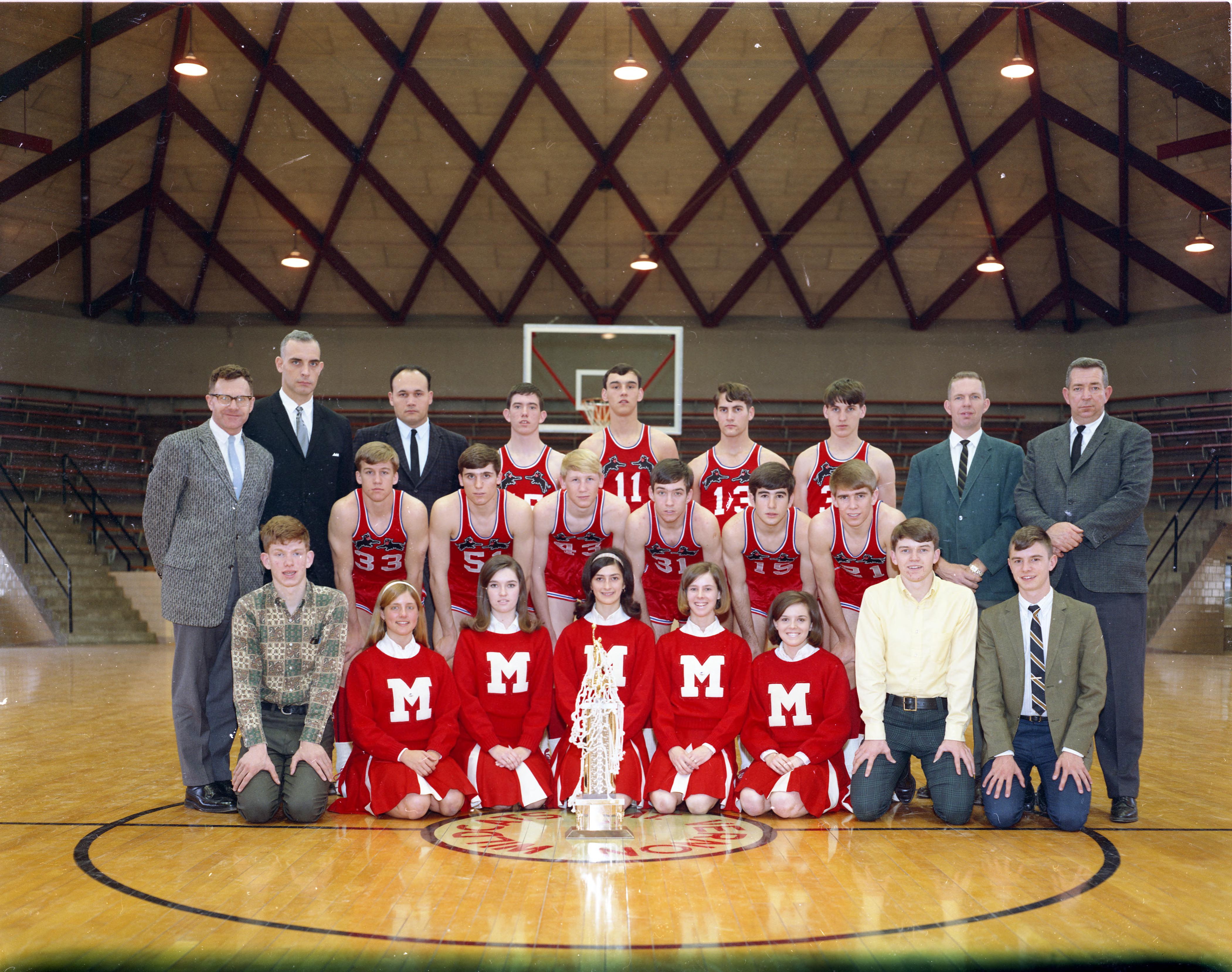 Mt. Vernon High School. Basketball winners of the sectional. According to IHSAA records, Mt. Vernon has won 17 sectional championships. This may have been the first (1967-68).. Front Row (left to right) Unknown, Debby Hartman, Unknown, Marie Weinhraut, Carolyn Russell, Unknown, Mike Creasy, Unknown. Middle Row- John B. Stone, Jim Adkins, Jim Rueger, Bill Lewis, Dennis Reineke, Jeff Hartman, Bill Newman. Back Row- Coach Hobby Gibbs, Coach Frazier, Terry Clayton, Bill Bullard, Unknown, Randy Boyer, Chuck Valier, bill Newman Sr.