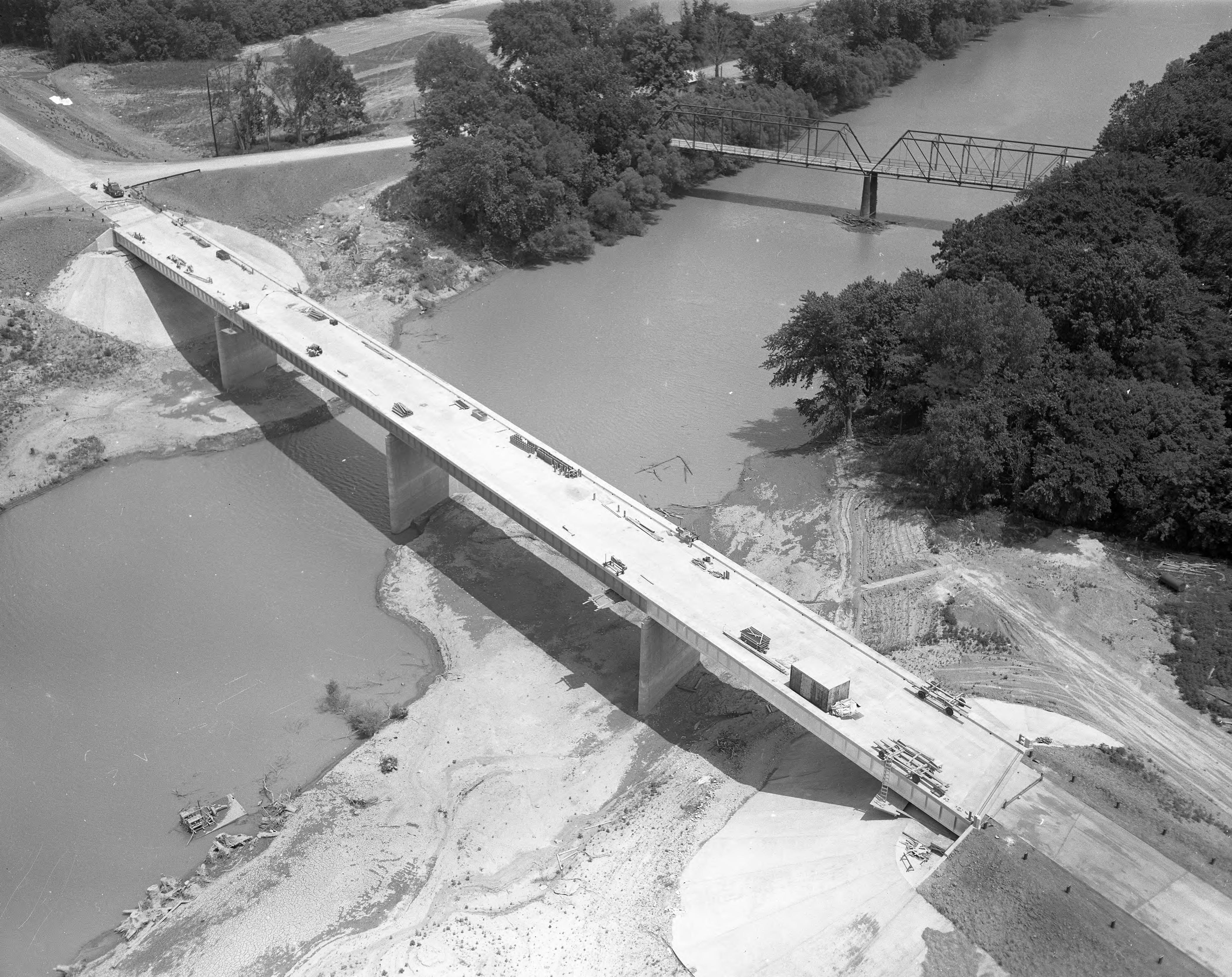 The bridge on the left is the I-64 Wabash River Bridge between Posey County, Indiana and White County, Indiana, built in 1967. On the right is the Grayville (Illinois Central) railroad bridge, built in 1892, rehabilitated in 1972, abandoned in 1996, partially destroyed by flooding in 2005.