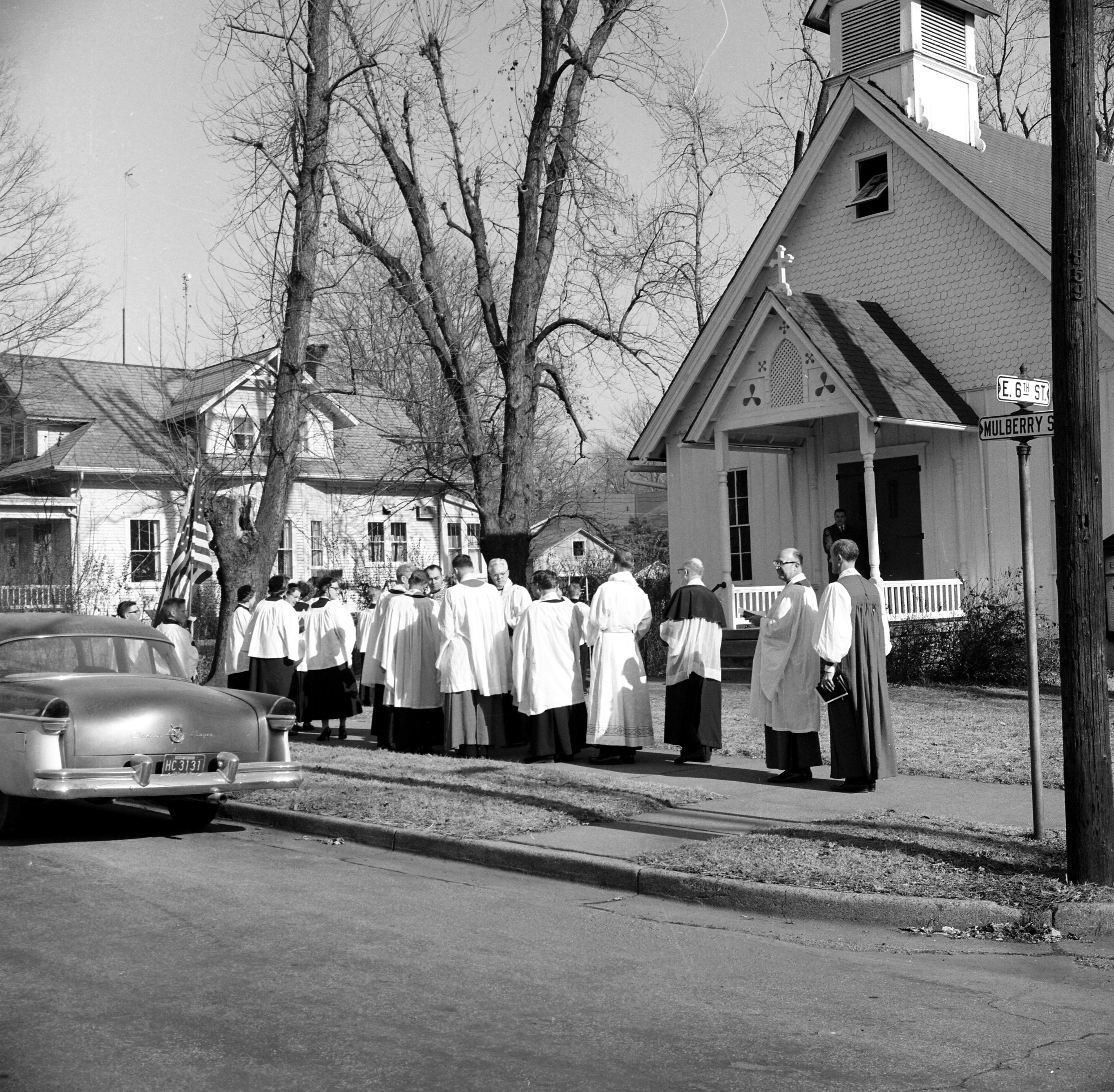 Procession to St. John's Episcopal Church at the corner of Mulberry and 6th Sts. The church celebrated its 100th anniversary in 1955--this might be the event seen here.