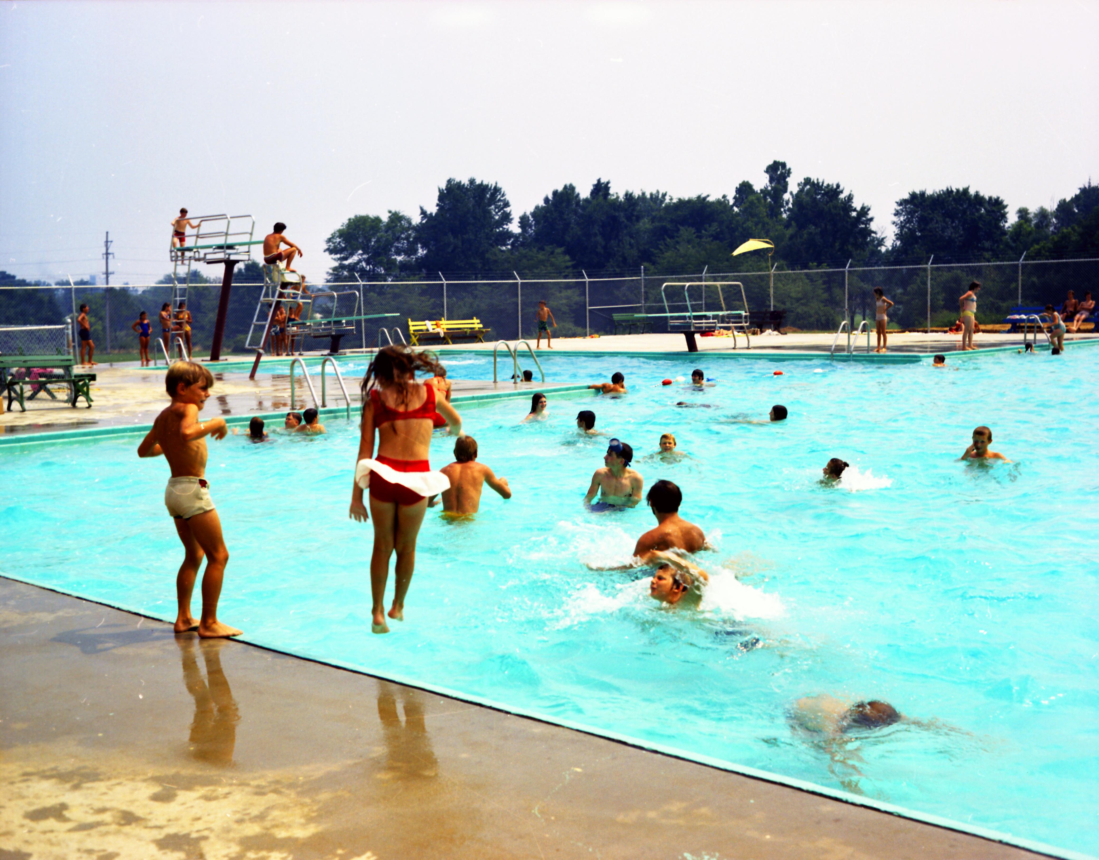 People swimming in the Brittlebank Park public pool. In the background is Farm Bureau Refinery
