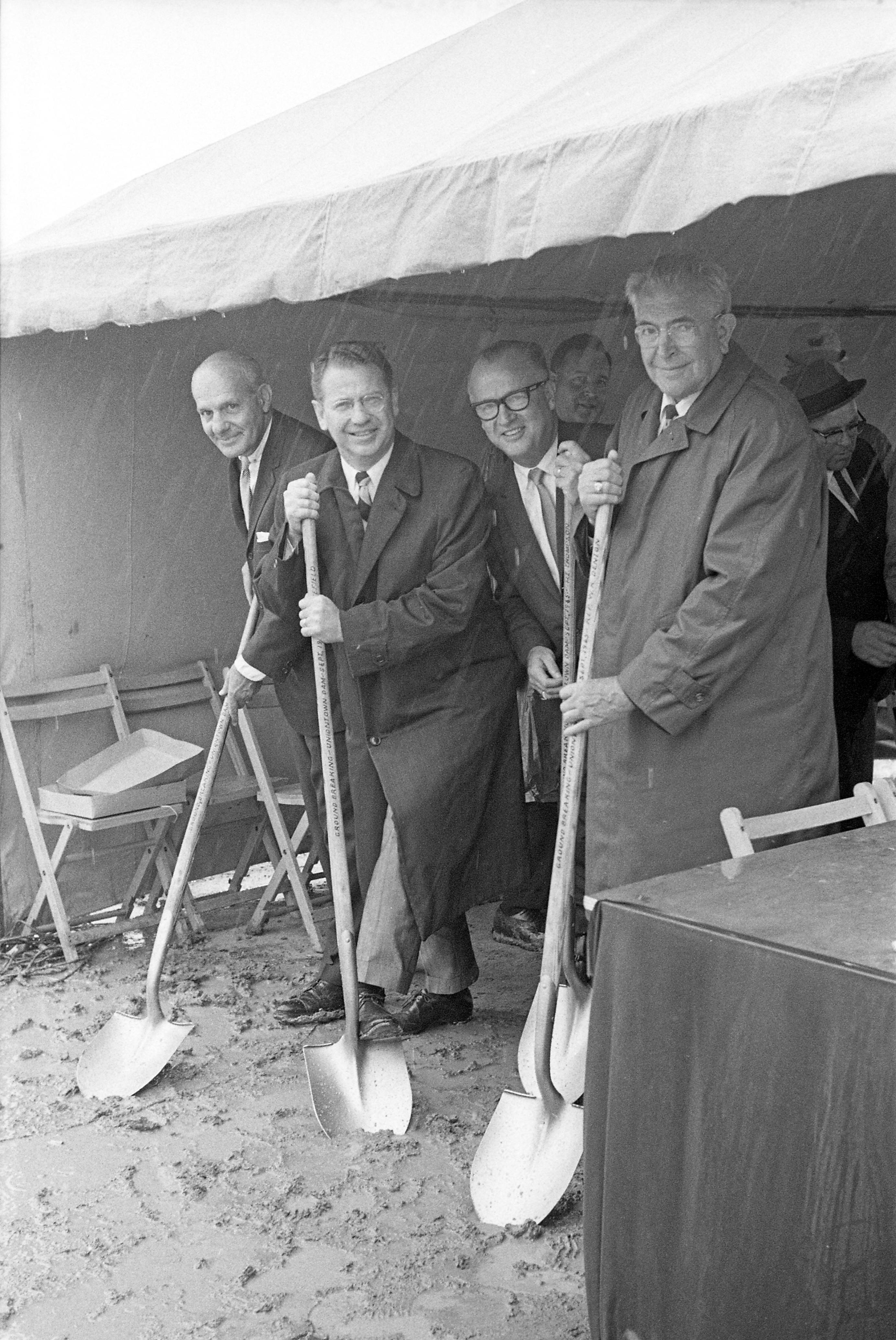 Ground breaking on Uniontown Lock and Dam. This dam replaced the lock and dams numbers 48 and 49. The facility is in Posey County, Indiana and Union County, Kentucky. It was the 17th lock and dam built on the Ohio River. It was renamed the John T. Myers Lock and Dam in 1996. Unknown, Senator Vance Hartke and former Mayor of Evansville, Indiana, unknown, and unknown men with shovels.