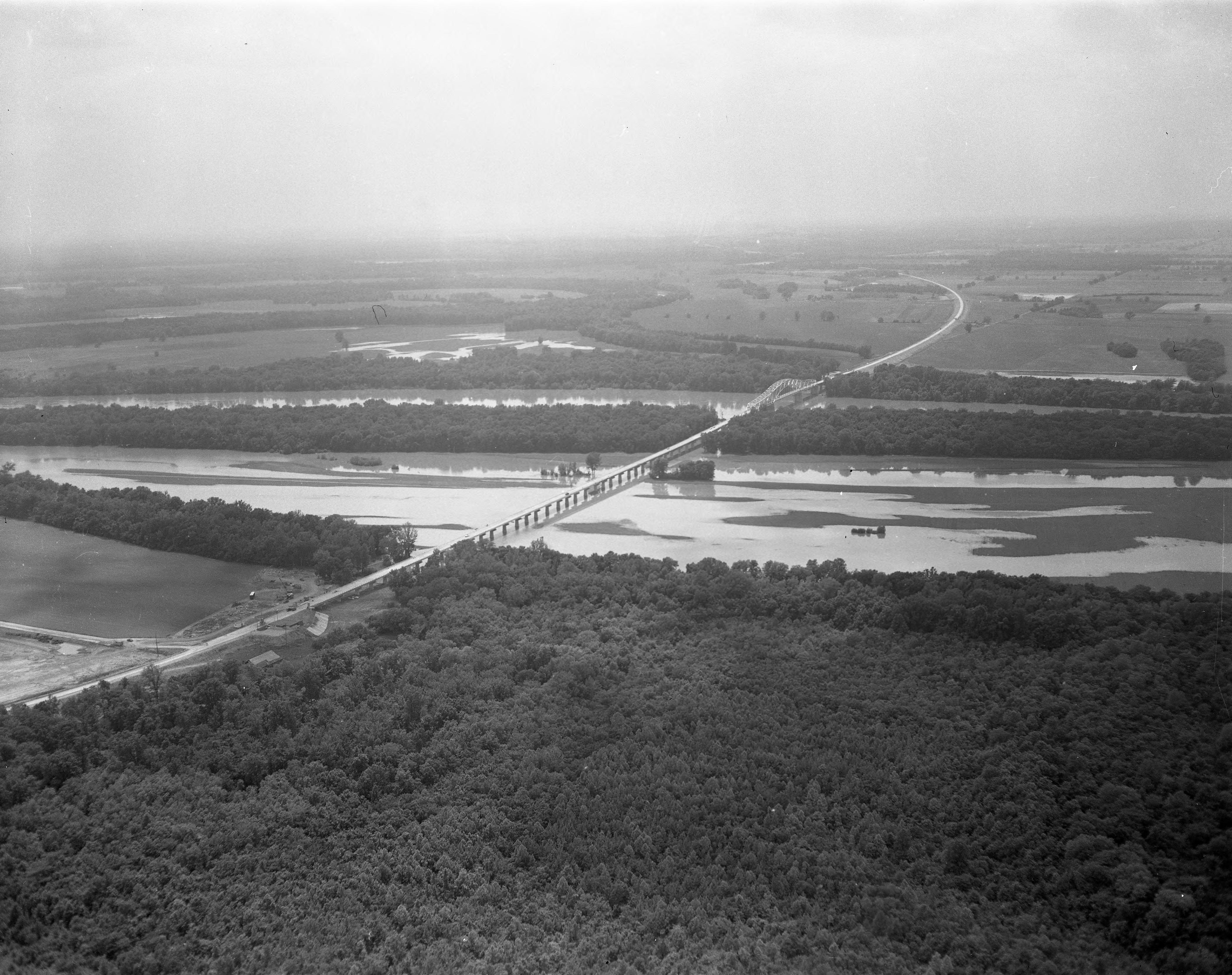 Construction of the Wabash Memorial Bridge, a steel arch bridge over Wabash River connecting IN 62 and IL 141 between the towns of Mt. Vernon, IN and New Haven, IL. It was built in 1956 by Olinger Brothers and Traylor Brothers Inc. As of July 1, 2014, no more tolls were collected.
