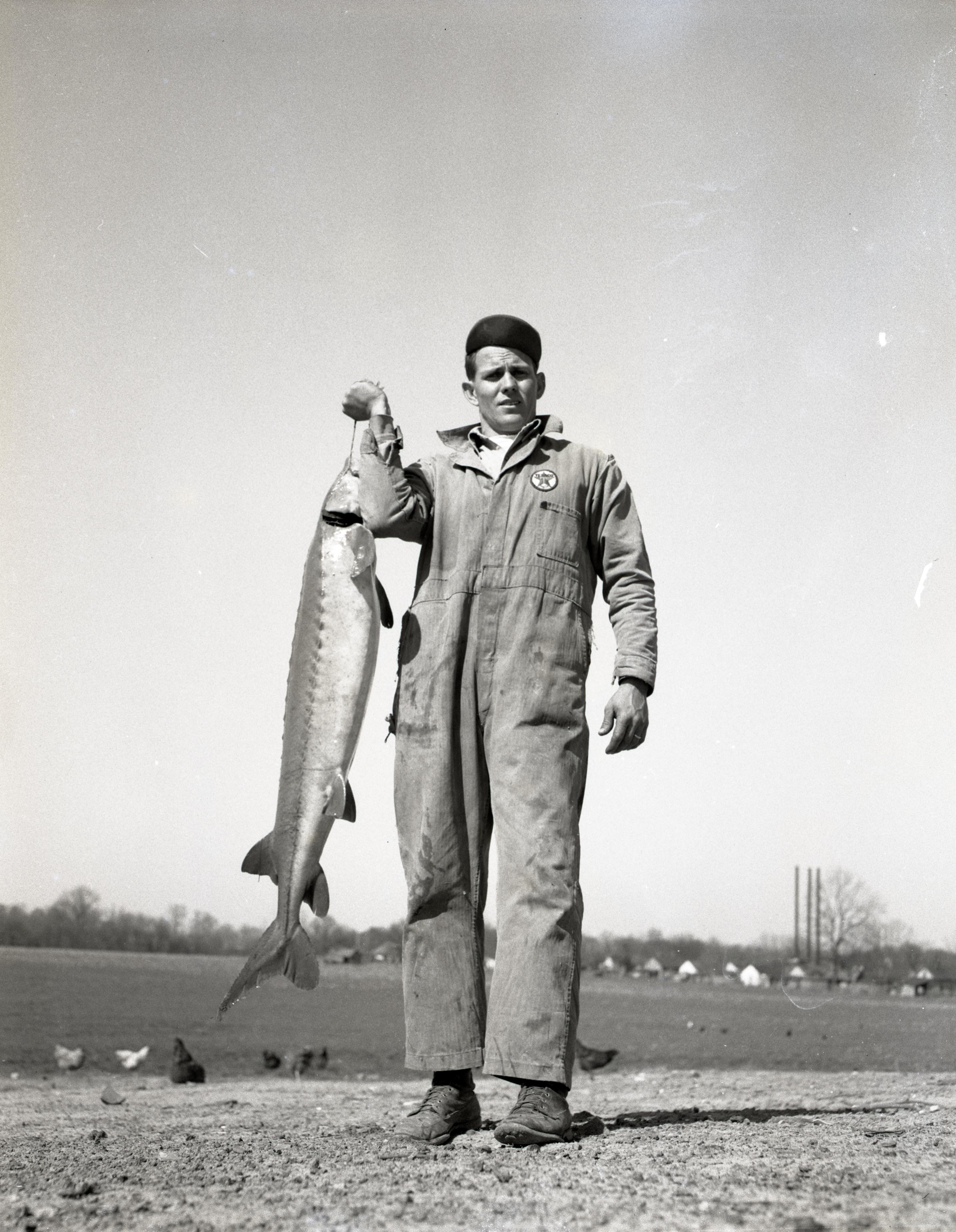 Sturgeon caught in Ohio River--the fisherman is wearing coveralls from Texaco.