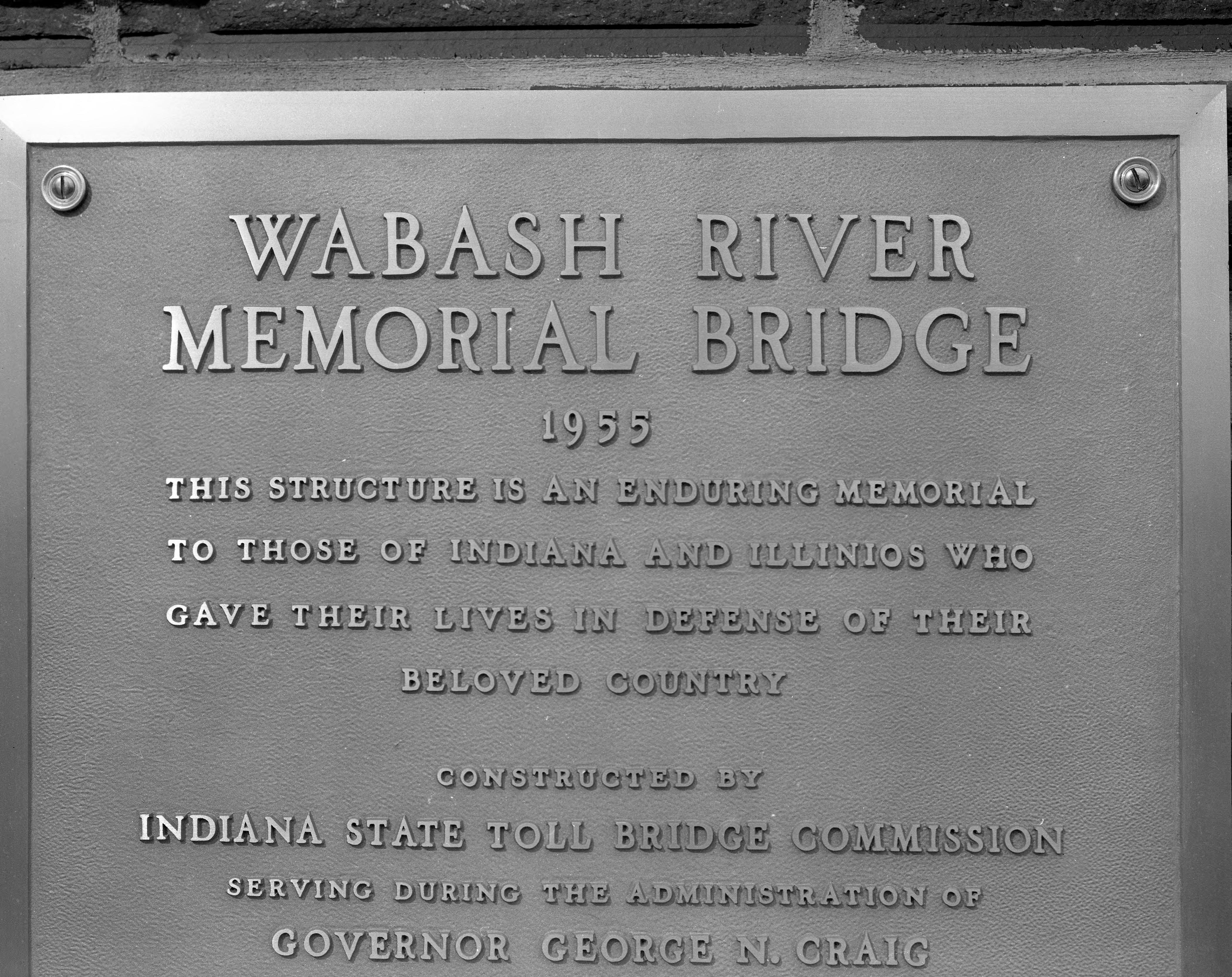 Dedication sign for the Wabash Memorial Bridge, a steel arch bridge over Wabash River connecting IN 62 and IL 141 between the towns of Mt. Vernon, IN and New Haven, IL. It was built in 1956 by Olinger Brothers and Traylor Brothers Inc. As of July 1, 2014, no more tolls were collected.
