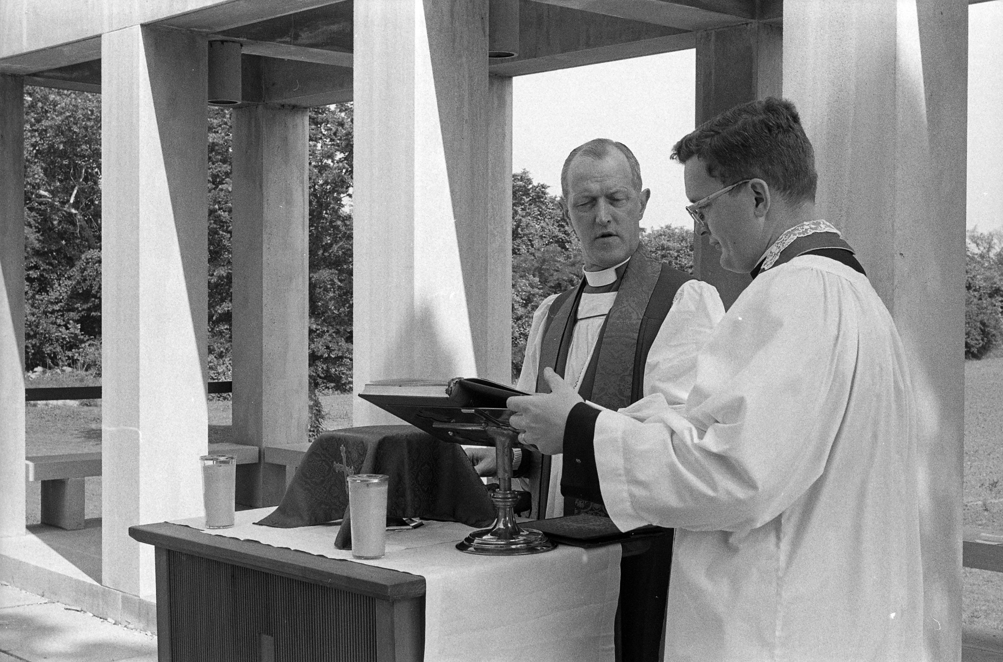 Possibly Bishop Craine and unknown man conducting a memorial service for Dr. Paul Tillich ceramony at the Roofless Church