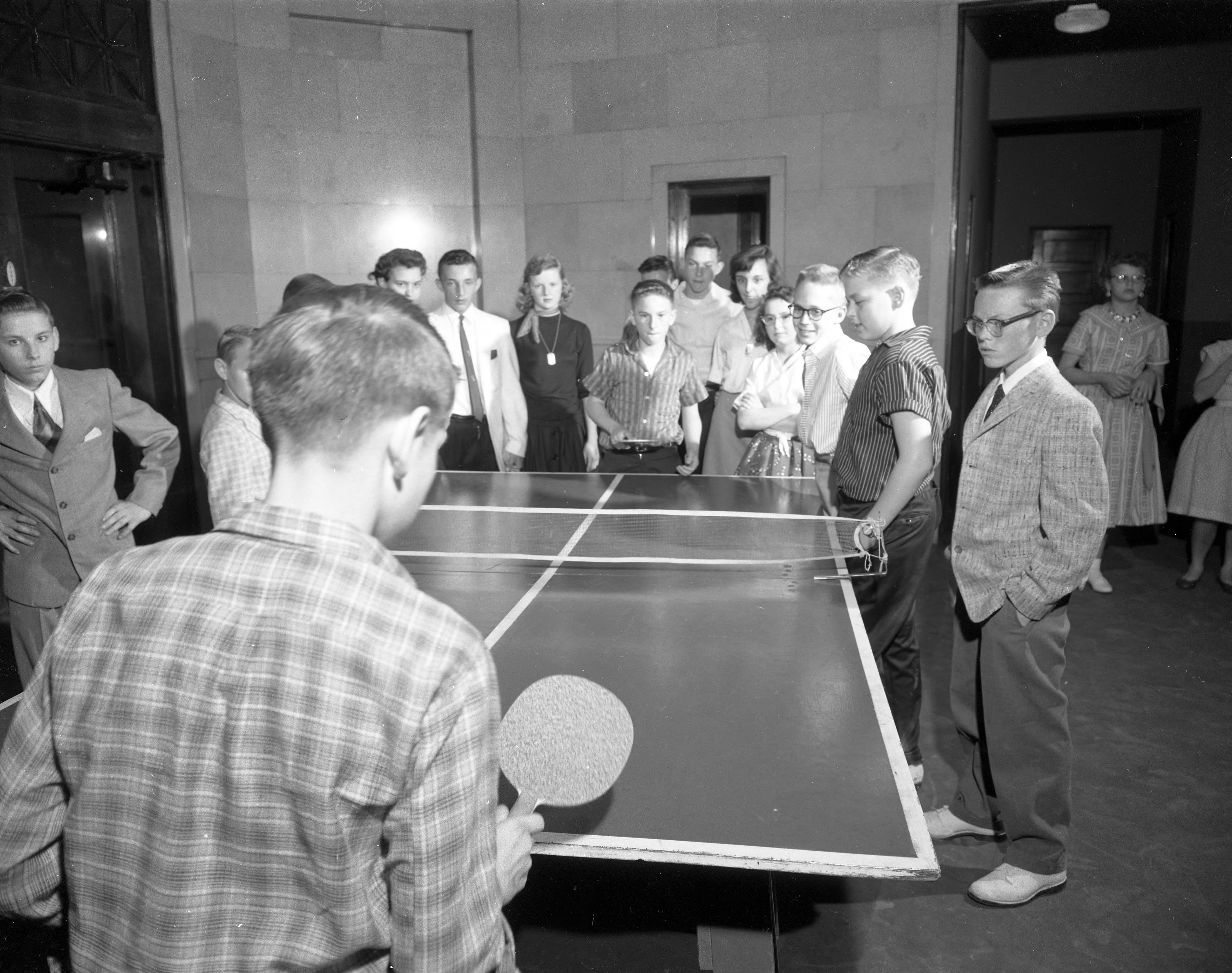 Playing ping-pong at the Posey County Memorial Coliseum, at 126 E. 3rd St., on the corner with Walnut St. These are probably students from the dance shown in MSS 022-0748 and 0749.This building, constructed for $2000,000, was dedicated on Armistice Day 1926. Posey County veterans of WWI, WWII, Korea, and Vietnam are honored on plaques in the interior. The original building had an auditorium, gym, pool, etc. After the 1937 flood, this building was used as a hospital and dormitory. Today the structure is primarily used as government offices and as a meeting place.